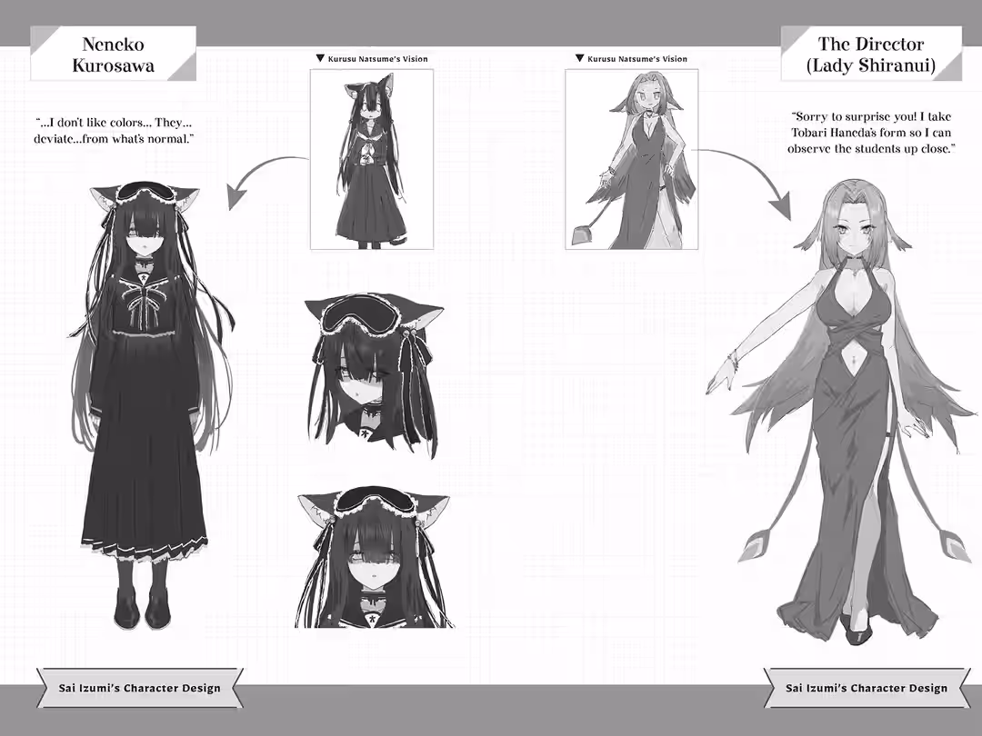 The artist in charge of this volume’s illustrations and character designs was, once again, Sai Izumi. Drumroll, please, for the three new characters and Lady Shiranui! Da-dum! Look! Mind-blowing! The gorgeous, classy, and adorable Karin; the energetic Machi with her rich expressions; the mysterious Neneko, who is hiding a passion stronger than anyone else; and Lady Shiranui with her adult allure but whose looks contain a trace of Tobari as well…!