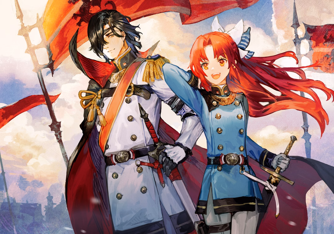 Fia × Captain. If possible, please add flags fluttering in the back (black dragon on a red background).