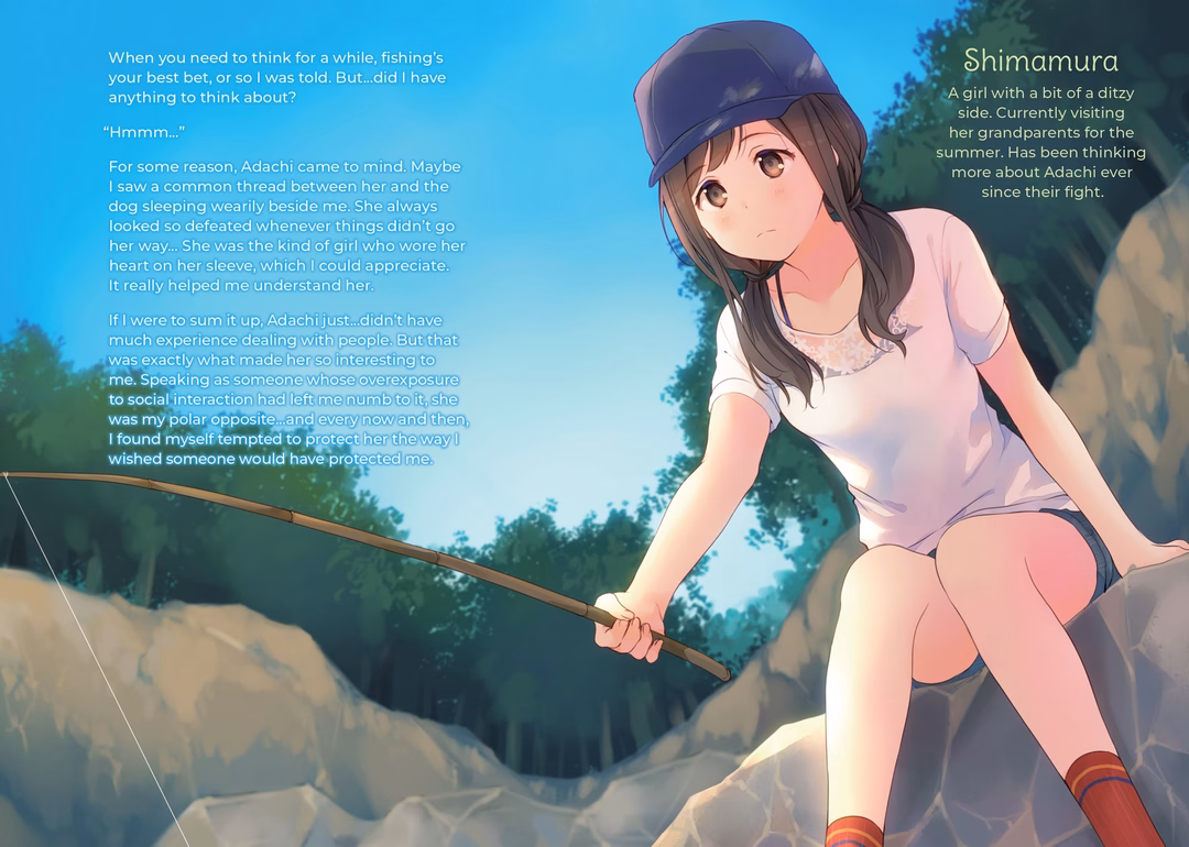 As I watched her go, it occurred to me that Adachi probably didn’t have any family traditions regarding the Bon Festival. If I had to choose, I’d say she was more of a city girl, surrounded on all sides by hard steel. Clean and cold, like she’d never touched dirt in all her life. That was the kind of vibe I got.