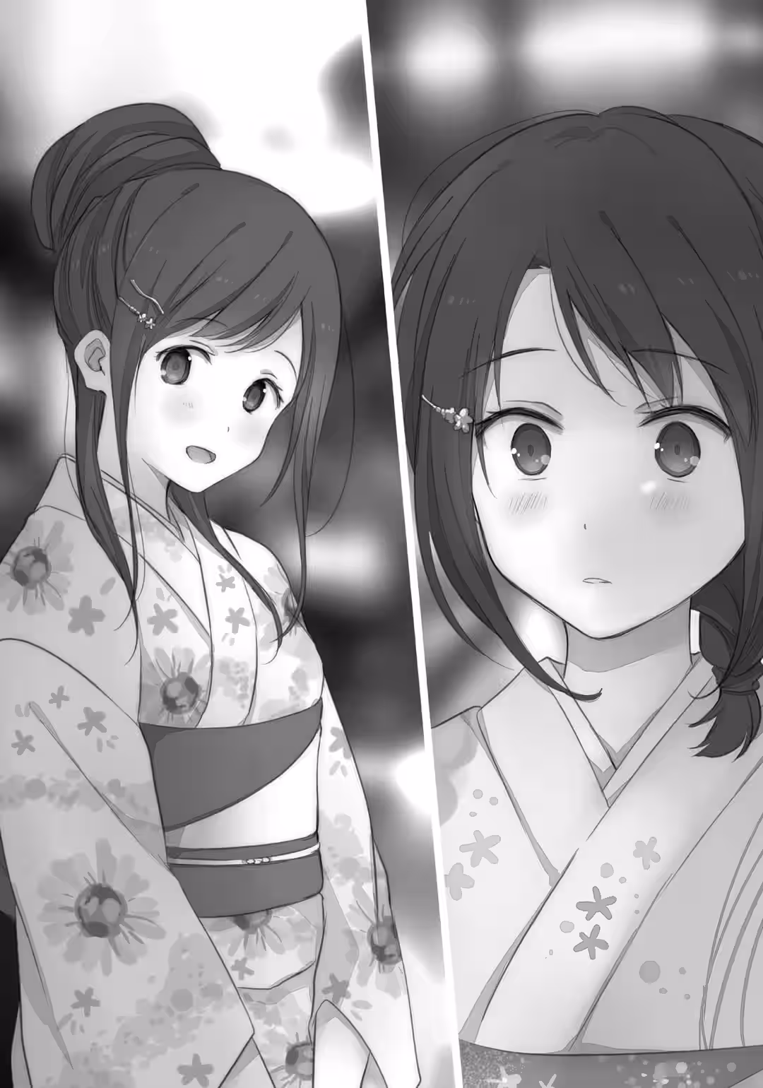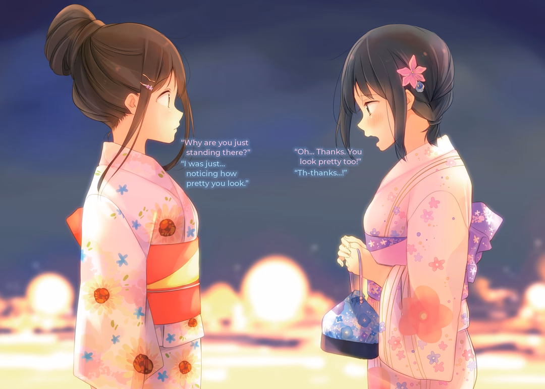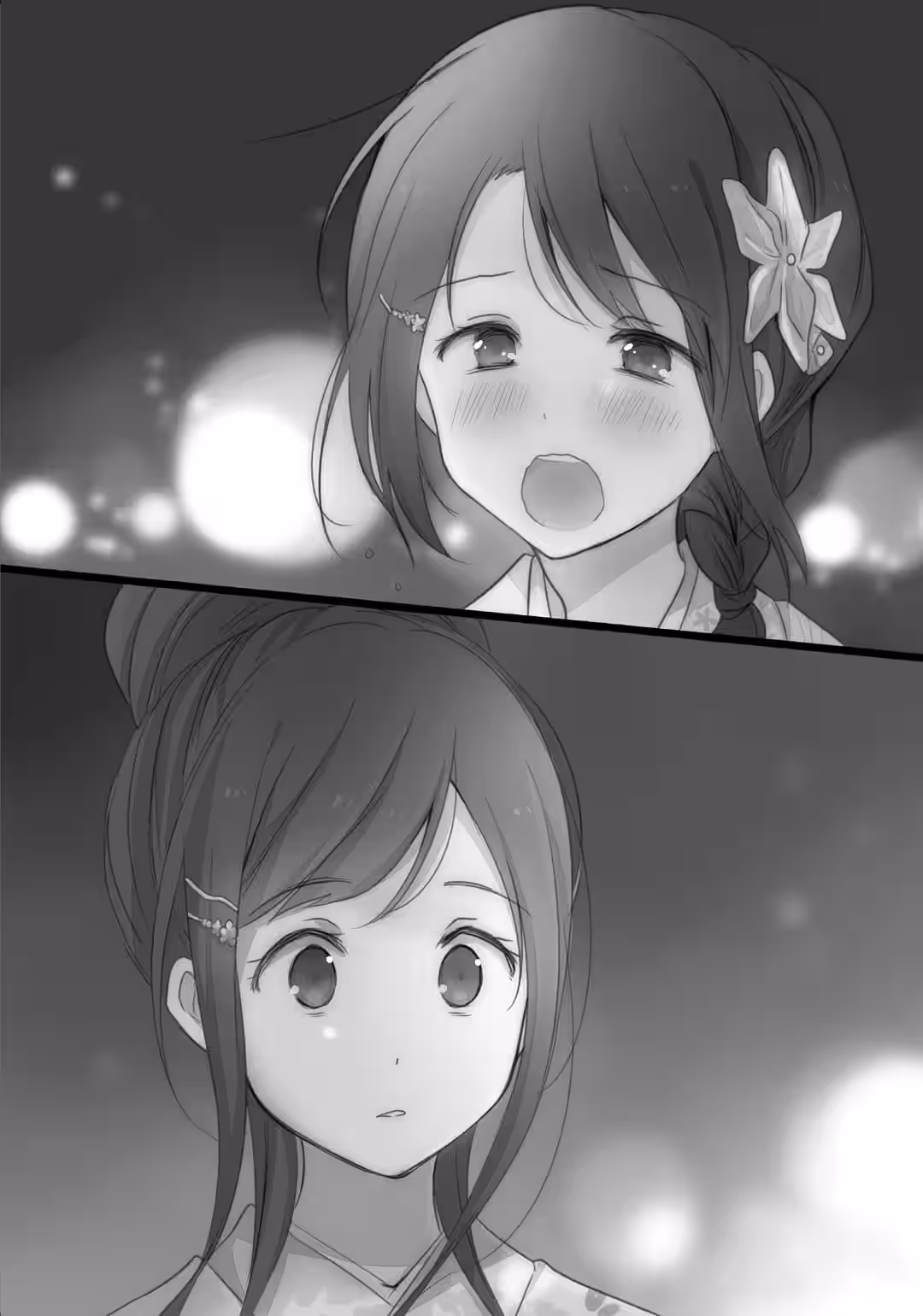 The crowd kept edging closer and closer to the river like they were drawn in by the fireworks. But I wasn’t looking at the sky at all—I was more captivated by Shimamura. The multicolored glow afforded her a magical, ethereal beauty that penetrated my skin, my organs, my tear ducts, stirring me to life until all my purest emotions began to spill forth unhindered…and my only thought was that I wanted to tell her. Something inside me was crying out, begging to be heard.