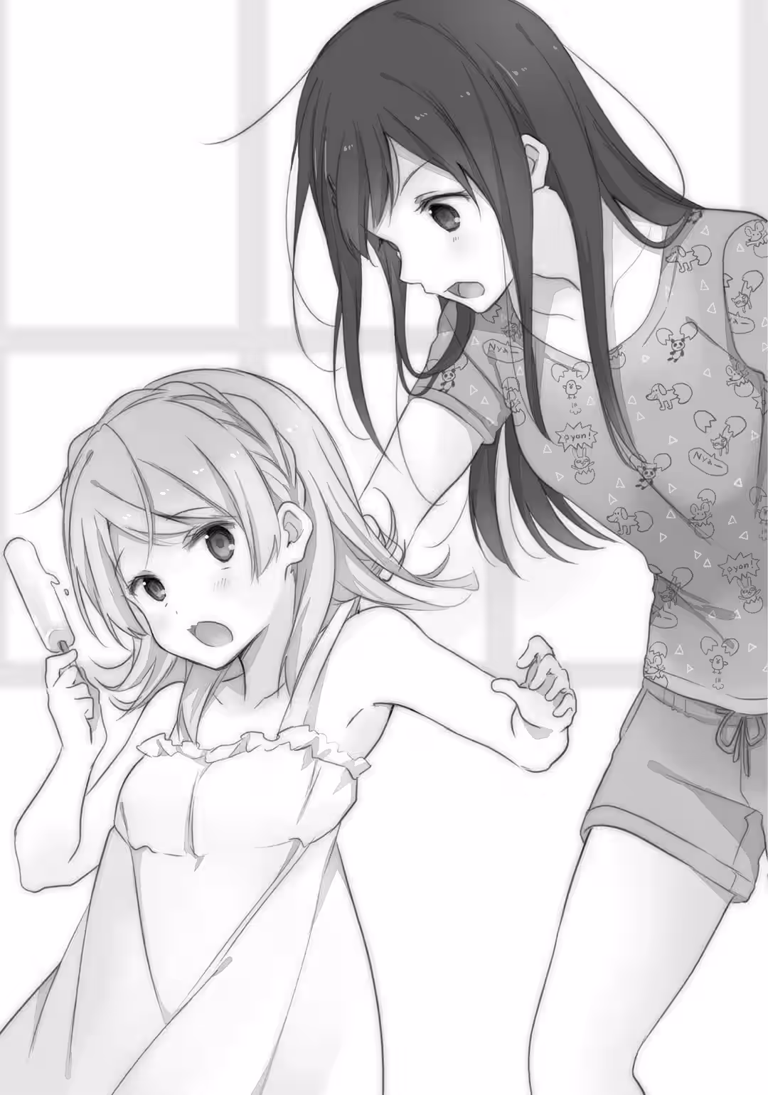 When I returned to my room, I found Yashiro lying on my blanket, slowly savoring an ice cream bar. Whether she got it from our freezer or brought it in from somewhere, I couldn’t tell. For a moment, I mused to myself idly that her hair looked even more refreshing than the ice cream… Then I belatedly realized she was going to drip it all over my dang blanket.