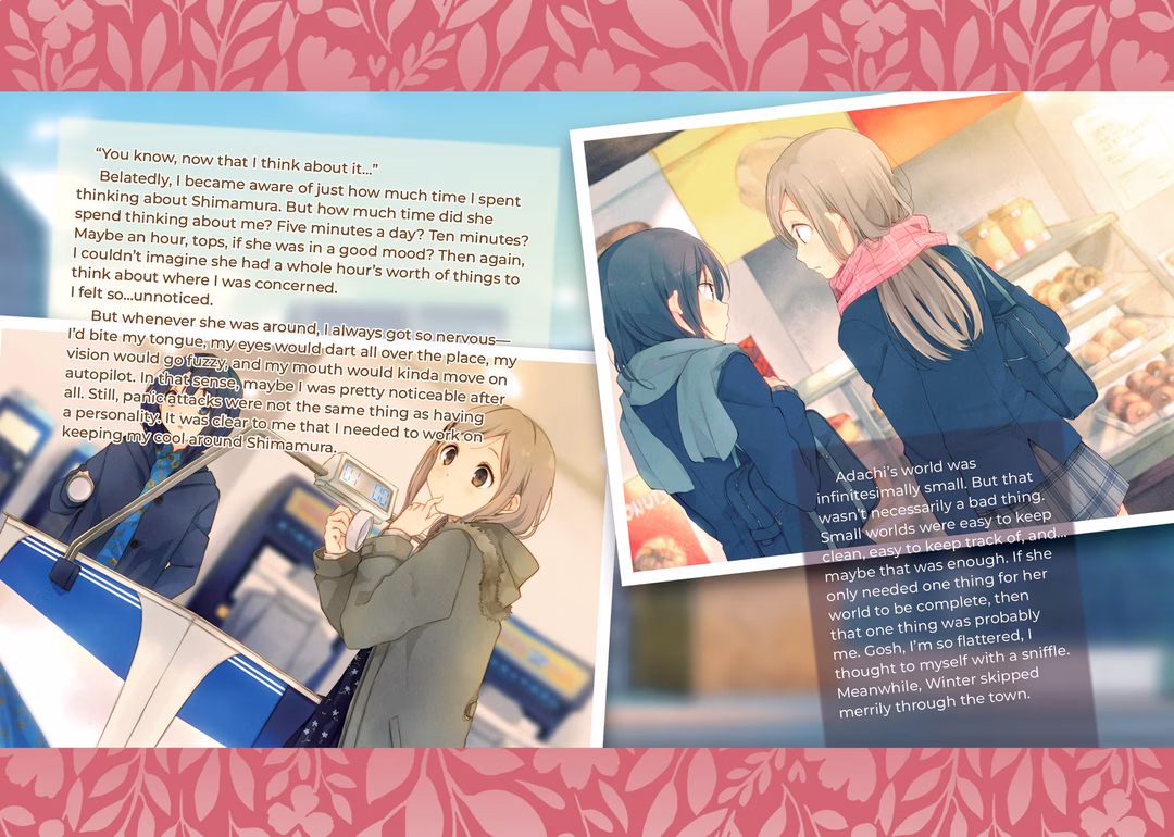 Based on what I’d heard from other people, however, Adachi would most likely never have any of these “reunions” at all. Adachi’s world was infinitesimally small. But that wasn’t a bad thing, necessarily. Small worlds were easy to keep clean, easy to keep track of, and…maybe that was enough. If she only needed one thing for her world to be complete, then that one thing was probably me. Gosh, I’m so flattered, I thought to myself with a sniffle. Meanwhile, Winter skipped merrily through the town.