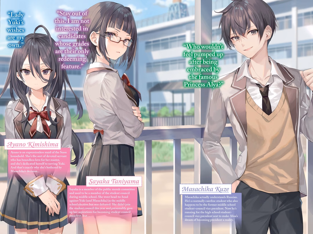 He always wondered why Sayaka didn’t join the student council. Usually, you’d want to become a member during your first year of high school if you were serious about becoming the student council president. She did actually join in middle school with that goal as well. On the other hand, it wouldn’t be a surprise if she decided not to join the student council because she had given up on trying to exact her revenge on Yuki…and in the end, that was exactly what happened. Sayaka realized that she wouldn’t be able to defeat Yuki, so she dropped out. She most likely recognized Masachika’s achievements and skills as well. That was why she’d assumed that he would run with Yuki again this year. She never even doubted it. But Masachika decided to run with Alisa instead.