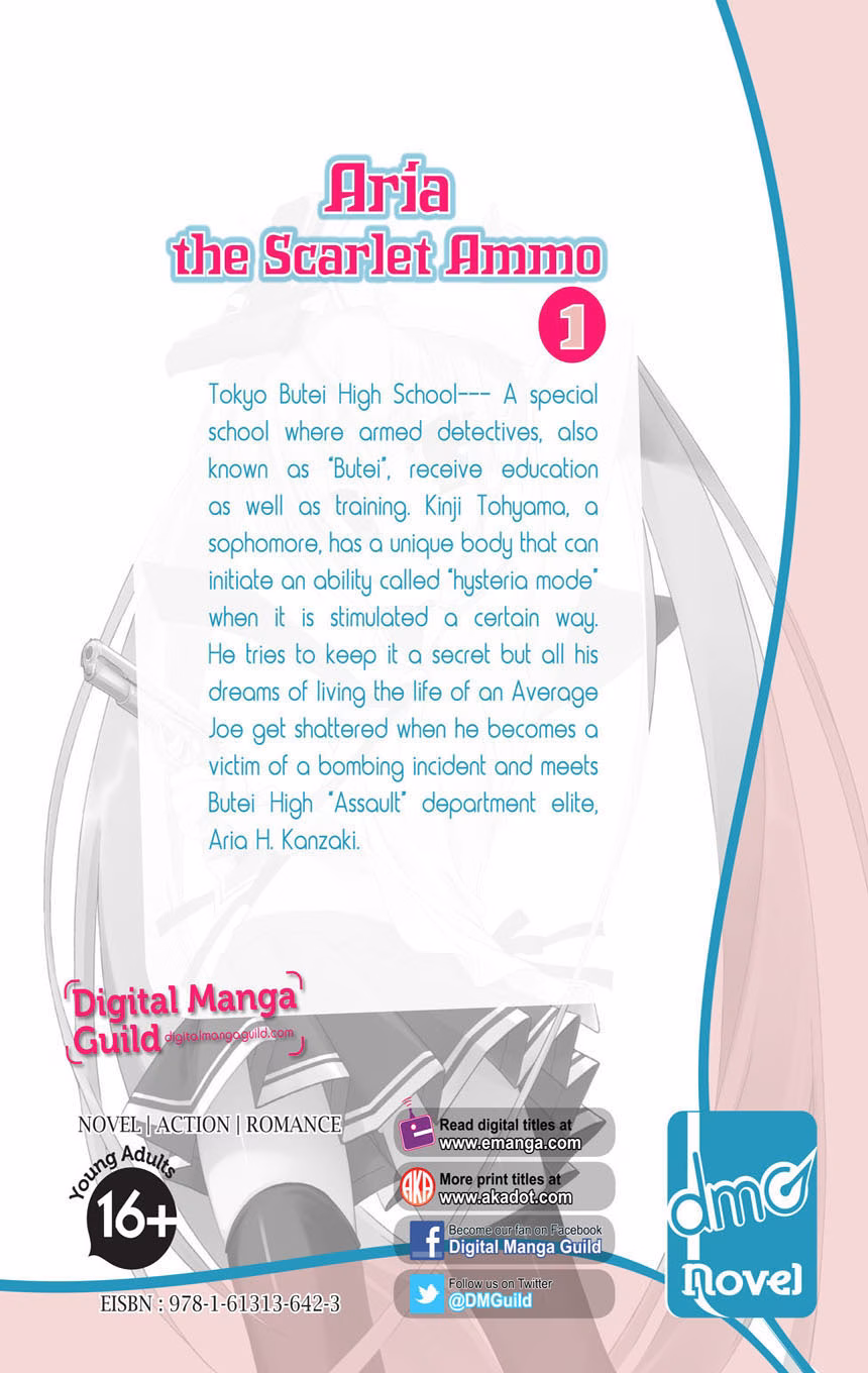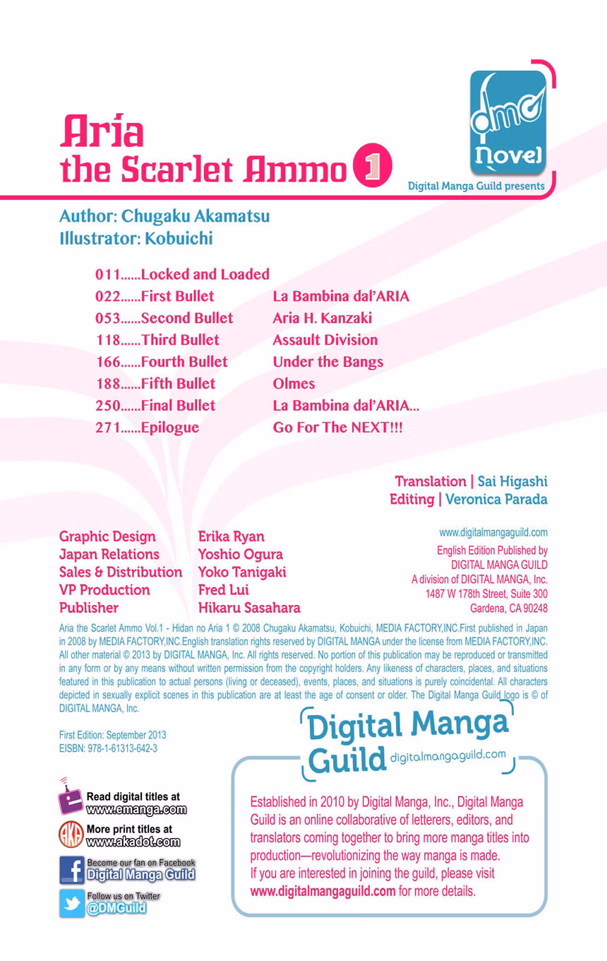 Aria: The Scarlet Ammo © Chugaku Akamatsu, Kobuichi. All rights reserved. Original Japanese edition published in 2008 by MEDIA FACTORY, INC. All other material © 2013 by DIGITAL MANGA, Inc. All rights reserved. No portion of this publication may be reproduced or transmitted in any form or by any means without written permission from the copyright holders. Any likeness of characters, places, and situations featured in this publication to actual persons (living or deceased), events, places, and situations is purely coincidental. All characters depicted in sexually explicit scenes in this publication are at least the age of consent or older. The Digital Manga Guild logo is © of DIGITAL MANGA, Inc.