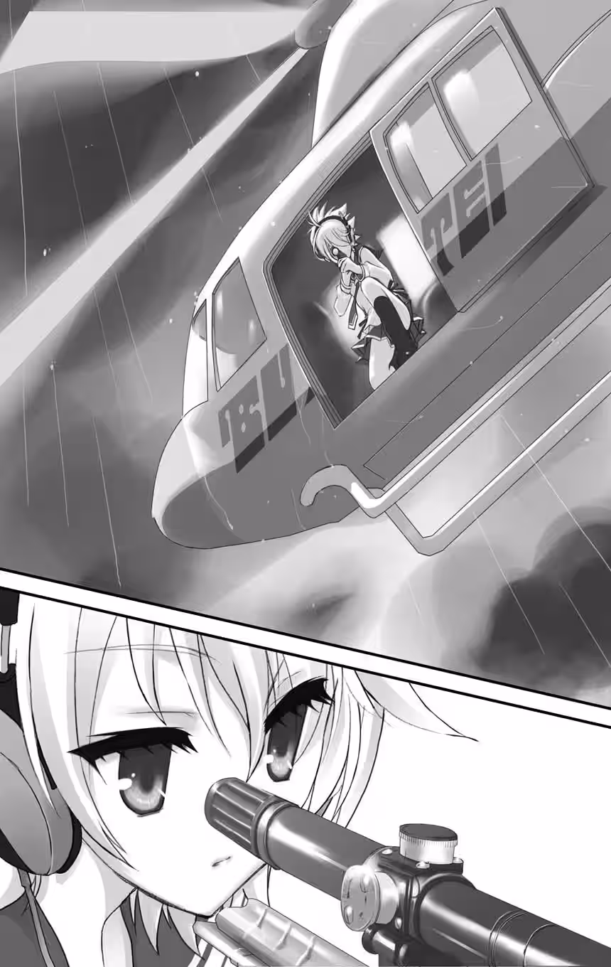 Aria was pulling down her lower eyelid with her index finger and sticking her tongue out at the helicopter in the sky while it sent her pigtails fluttering all over the place with the downward air current it was making. I’m not sure if that upset the people on board, but a few officials from the Bureau of Butei used a wire to descend from the helicopter onto the rooftop.