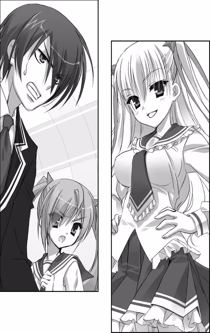 “Oh, forget it! I’ve chosen you, so I’ll just tell you! My name is…” Bearing her tooth, Aria put her hands on her hips with an exaggerated motion as she stuck out her chest, which couldn’t be pushed up or plunged. “Aria Holmes Kanzaki!”