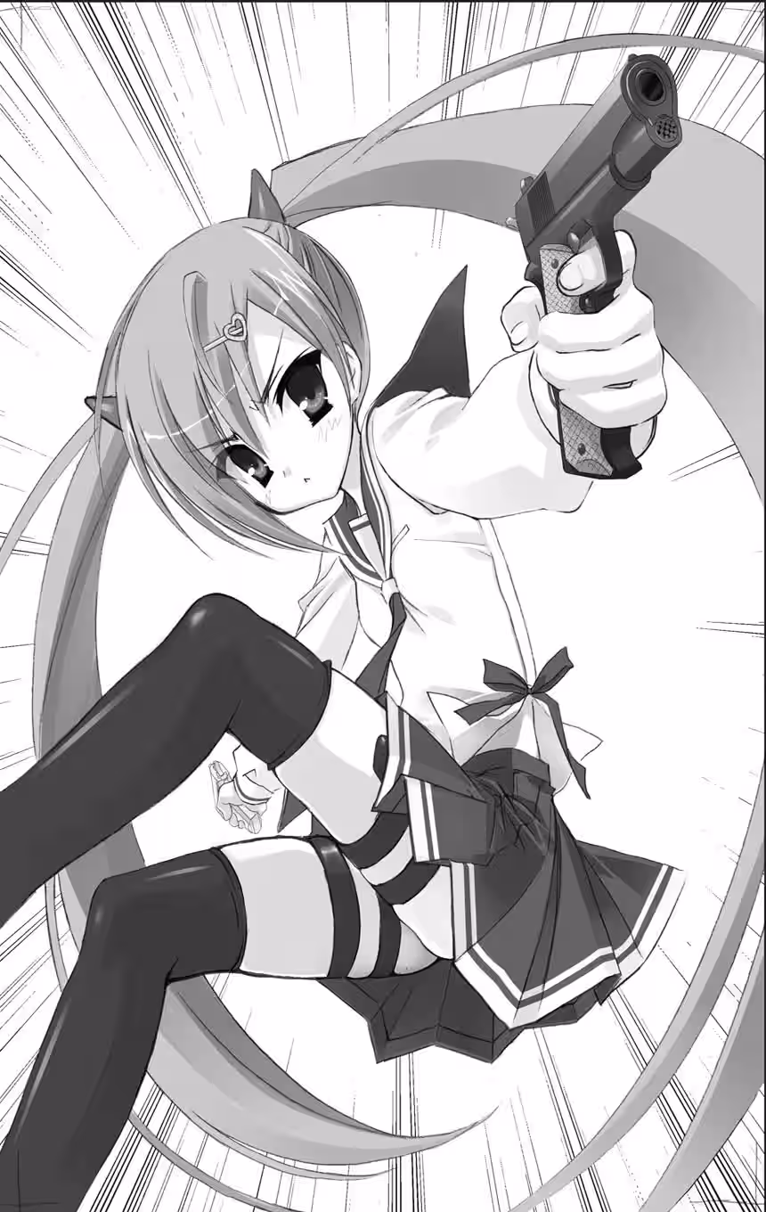 “Of course you do, Kin-chan. It’s school regulation,” said Shirayuki immediately getting on her knees and attaching a holster to my belt in which she placed the pistol.