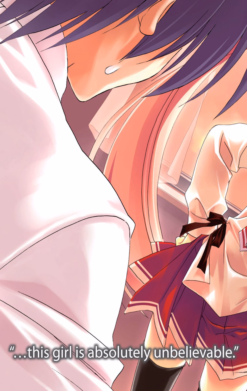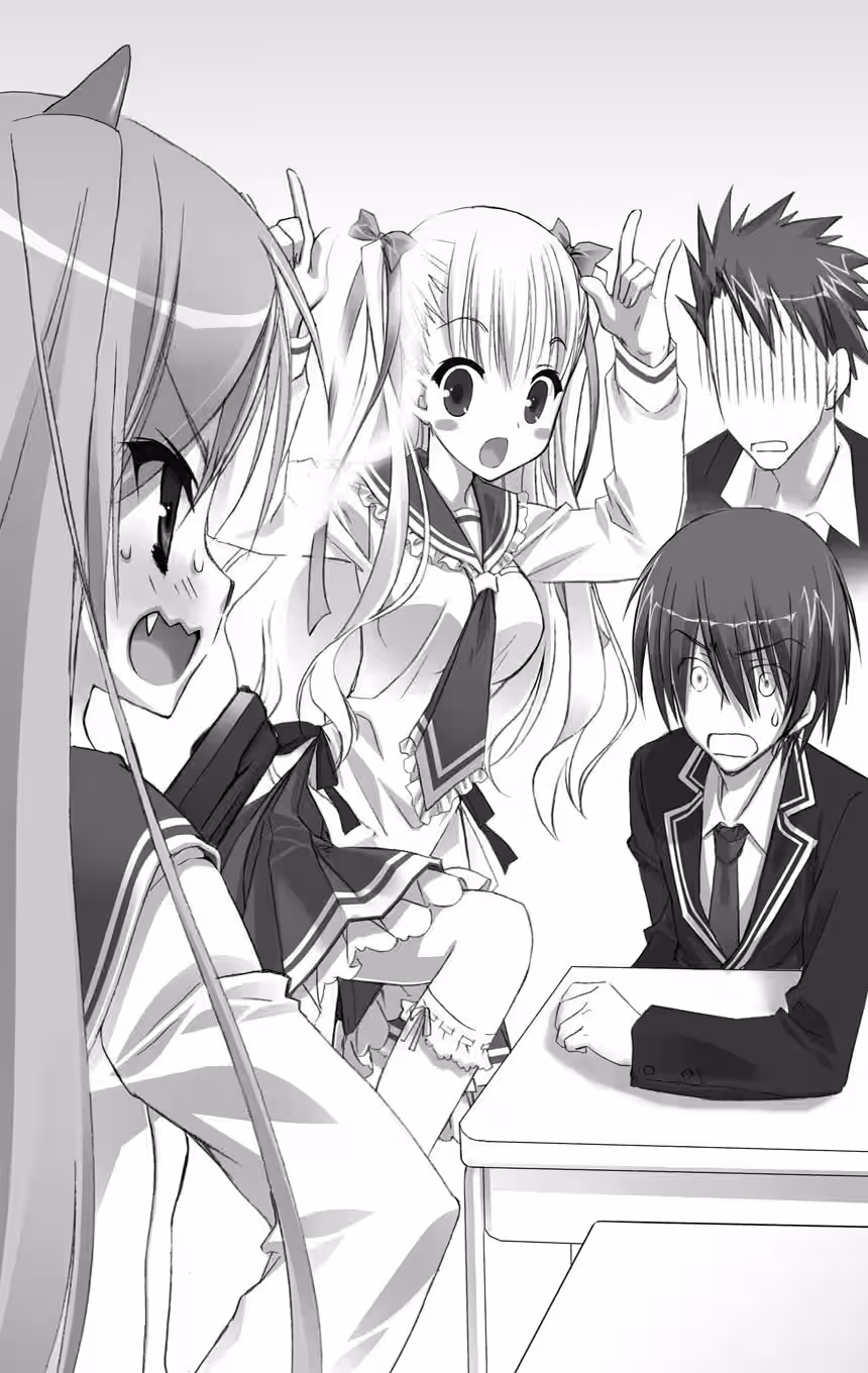 I don’t know about everyone else, but that’s why I, Kinji Tohyama, don’t need any girls falling out of the sky. I want to lead a normal, peaceful life. So the first thing I’m going to do is transfer out of this school. This utterly absurd school…