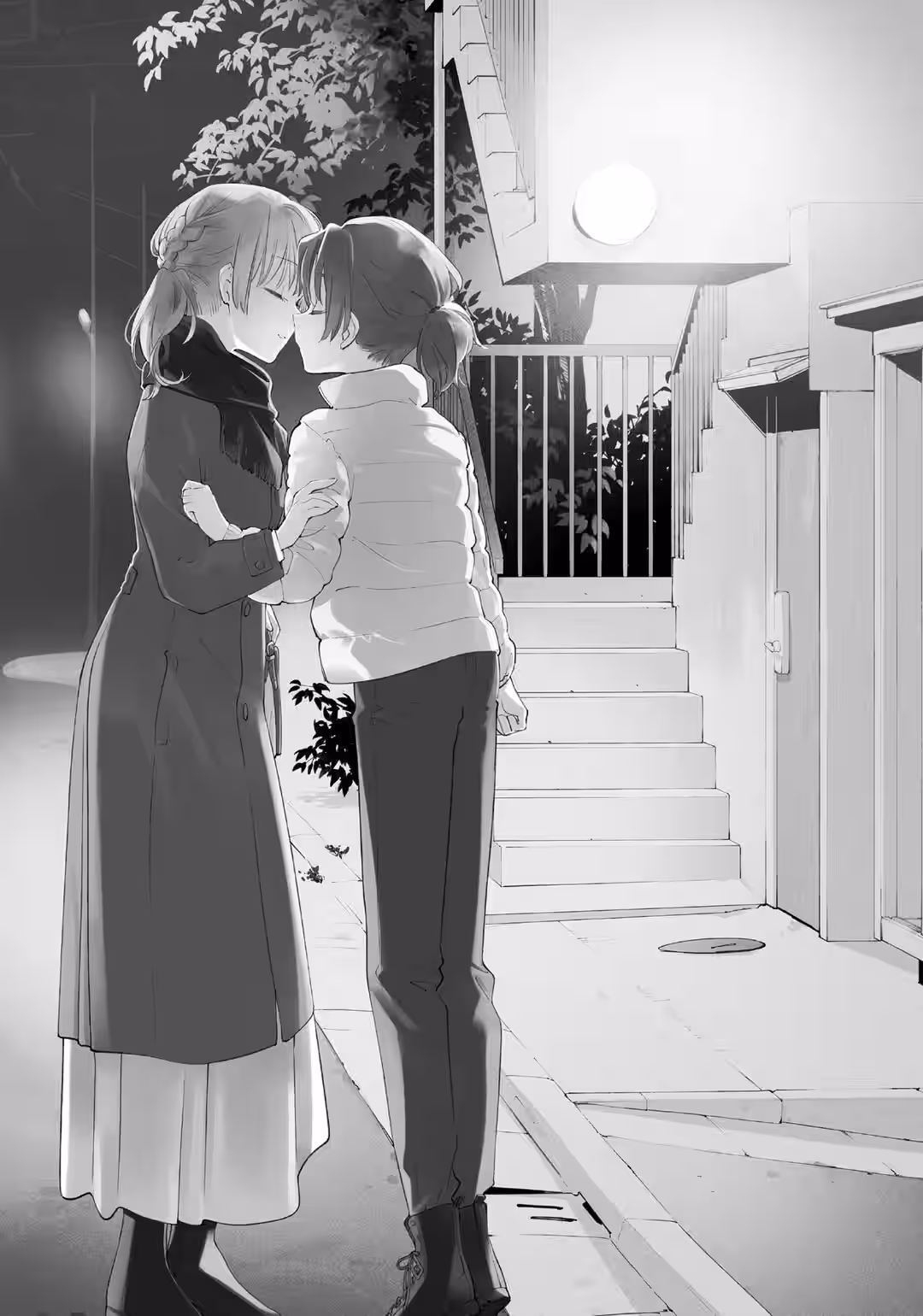 When I stooped slightly to bring my face closer, Haru immediately responded by stretching herself up slightly. As though a string were entangling us, our faces came closer together, and then met. No matter how many times we did it, the feeling of my breath being stopped by her lips made me feel almost as though I had landed somewhere… It gave me an odd sense of arrival and relief.