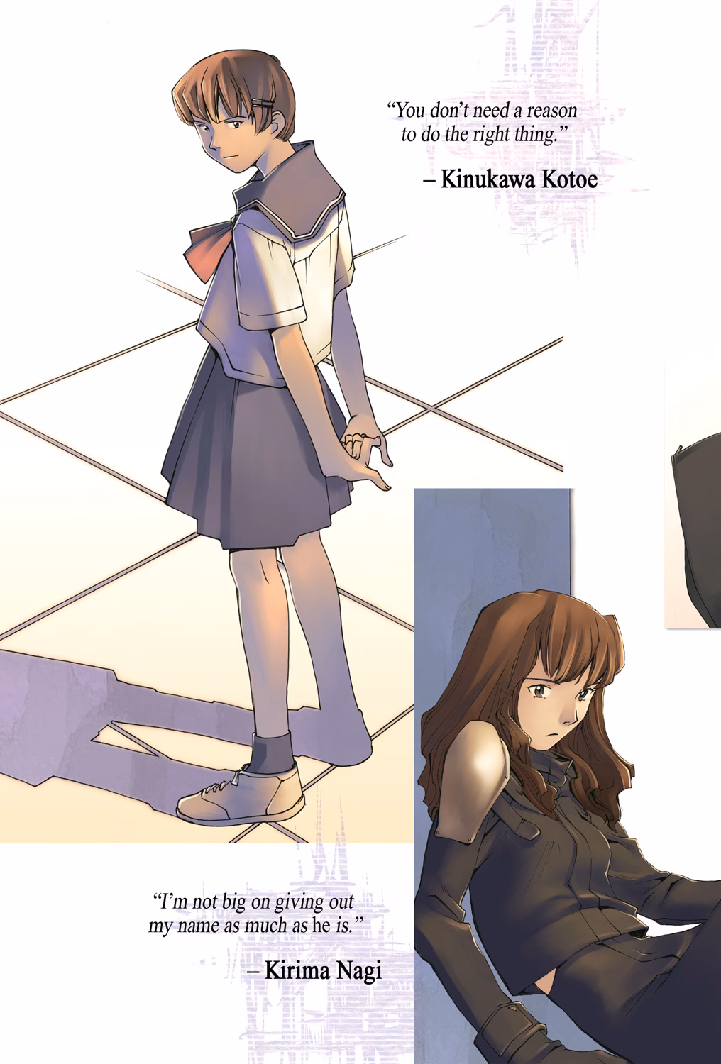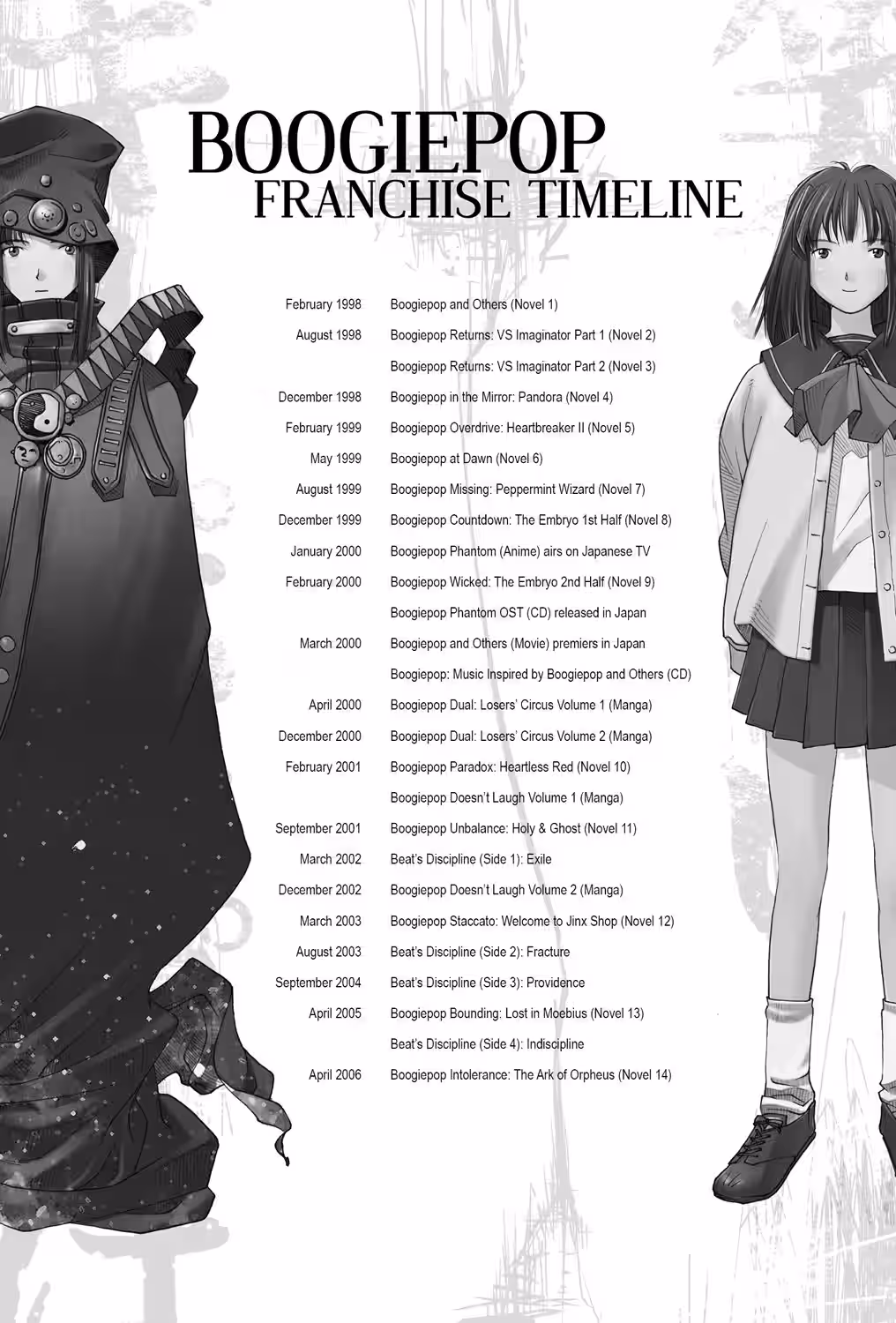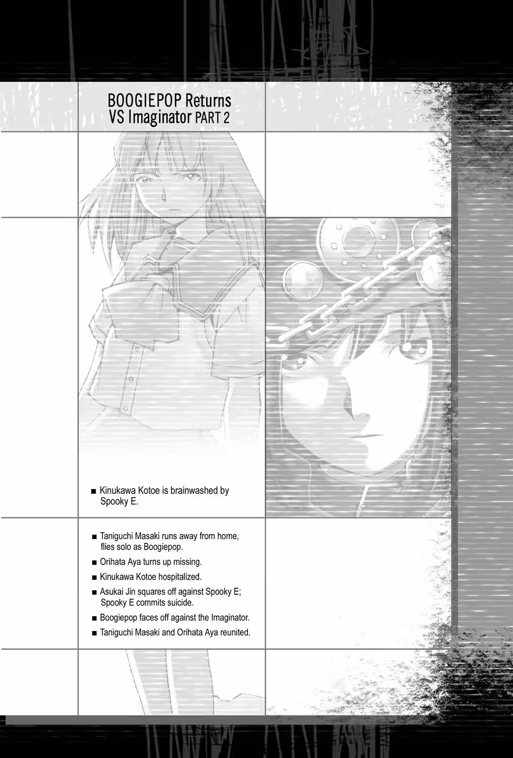 To ensure maximum authenticity in Seven Seas’ translation of Boogiepop and Others, all character names have been kept in their original Japanese name order with family name first and given name second. For copyright reasons, creator names appear in standard English name order.