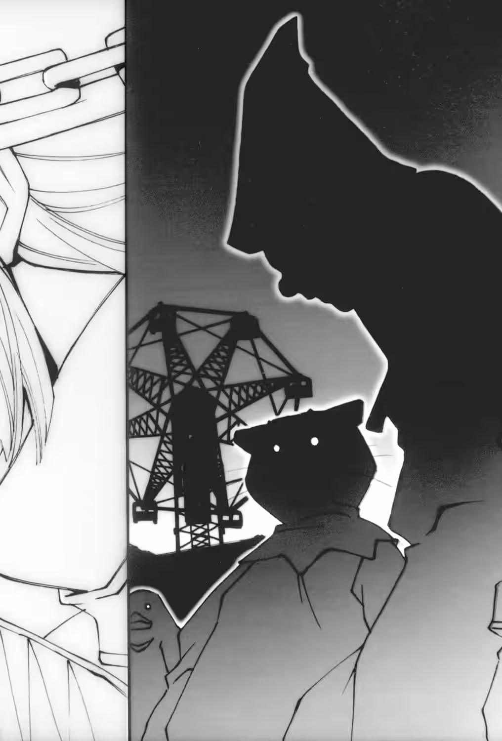 “…………” The other figure remained silent. It resembled a pipe more than a human with the shadow of the school building enveloping it, leaving it only partially visible.