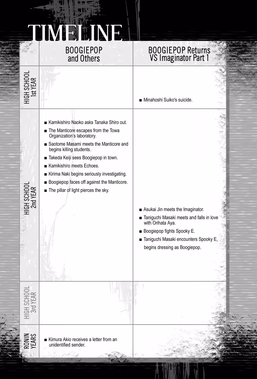 As in many cases, what was originally written to plug a book’s Japanese release gets revised and changed to better suit the title’s needs in foreign markets. In the case of Boogiepop, the original novel blurbs are a little bizarre, but they do act as an extension of the books themselves, giving further insight into the contents contained therein. In the case of the second novel, the blurb literally provides the best definition of what the Imaginator actually is. Likewise, the description for the first novel is the only hint we are ever given of the book’s original title—Boogiepop Doesn’t Dream.