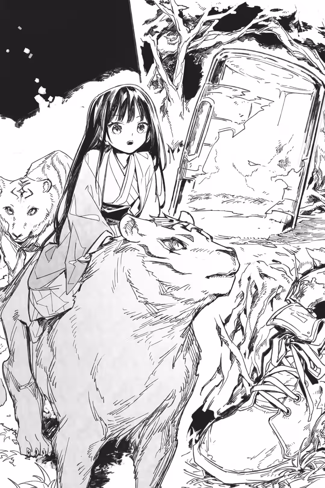 “Run!” Arai shouted, but she couldn’t. Her body wouldn’t move. Right as she despaired that she was going to die, a white tiger leaped from behind her and hacked apart the black deer skeleton with the white sword gripped in his mouth. The bones were sent flying.