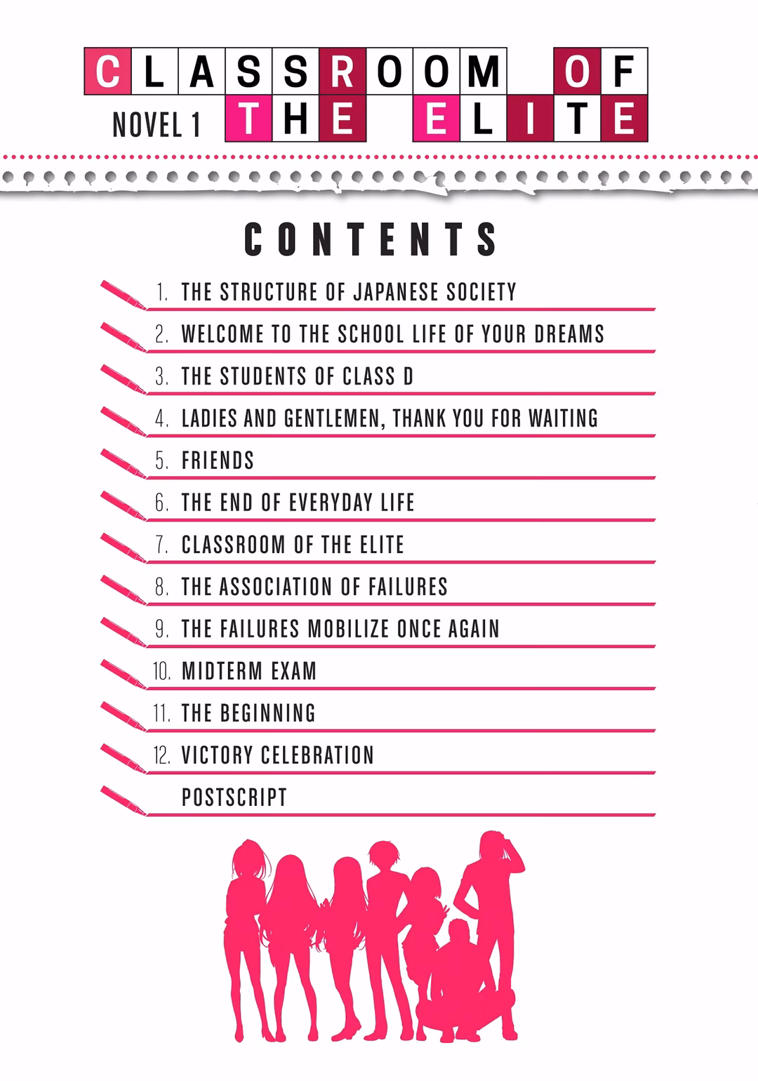 I sincerely apologize for the long silence. This is Kinugasa Syougo. It’s a pleasure to meet you. I wrote this story about a year ago. Classroom of the Elite came out of my transition from student to adult, and because I wanted to tackle a challenging subject. When I think back to my student days, I recall everyone continuously telling me that I had to study if I wanted to get into a good university, if I wanted to get a job in a good field, if I wanted to have a good life. Recently, I’ve had my doubts as to whether that advice was actually correct. Unfortunately, I’ve gone astray, and leapt into a world far different from the one that my family and peers imagined for me…