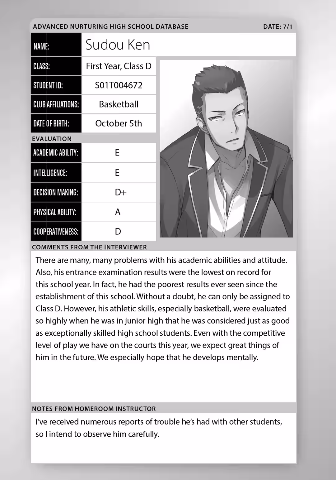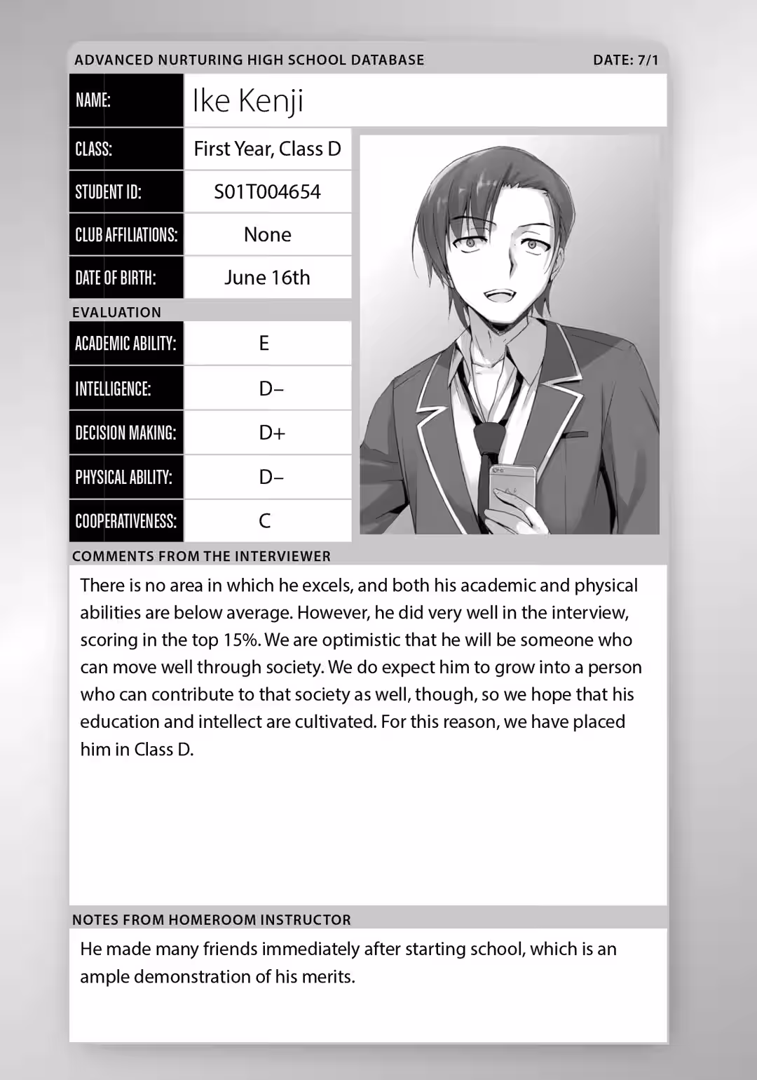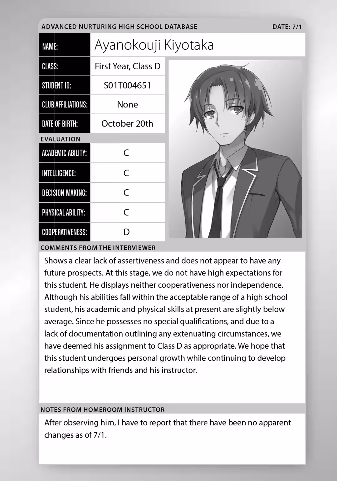 “In my personal opinion, Ayanokouji is the most defective student in Class D.”