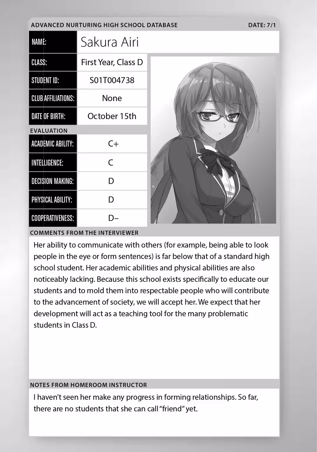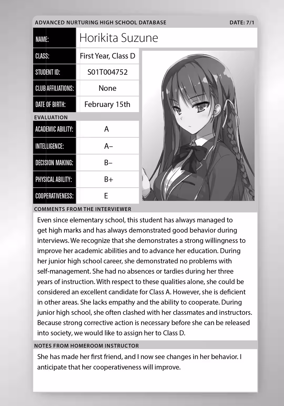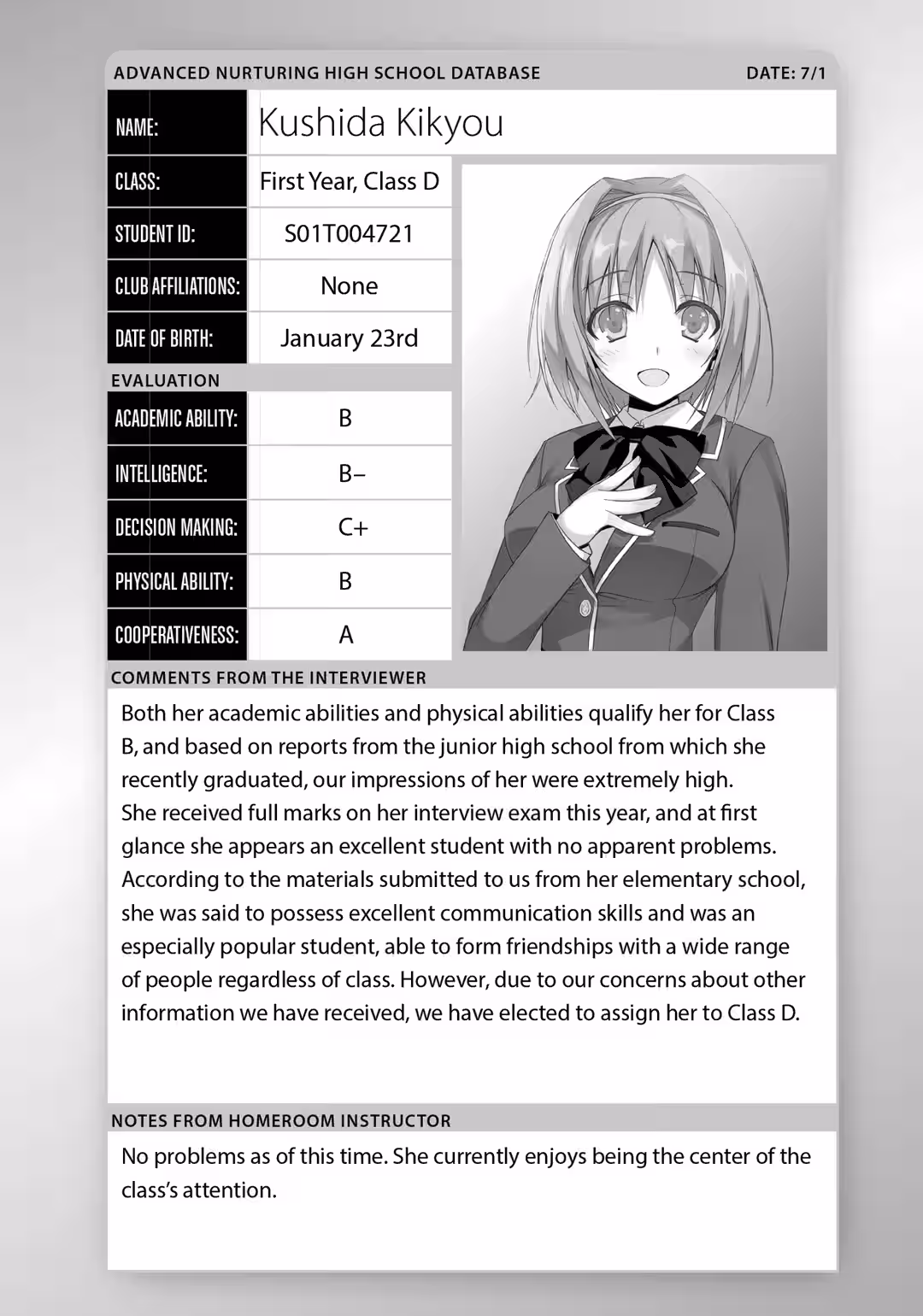 “In my personal opinion, Ayanokouji is the most defective student in Class D.”