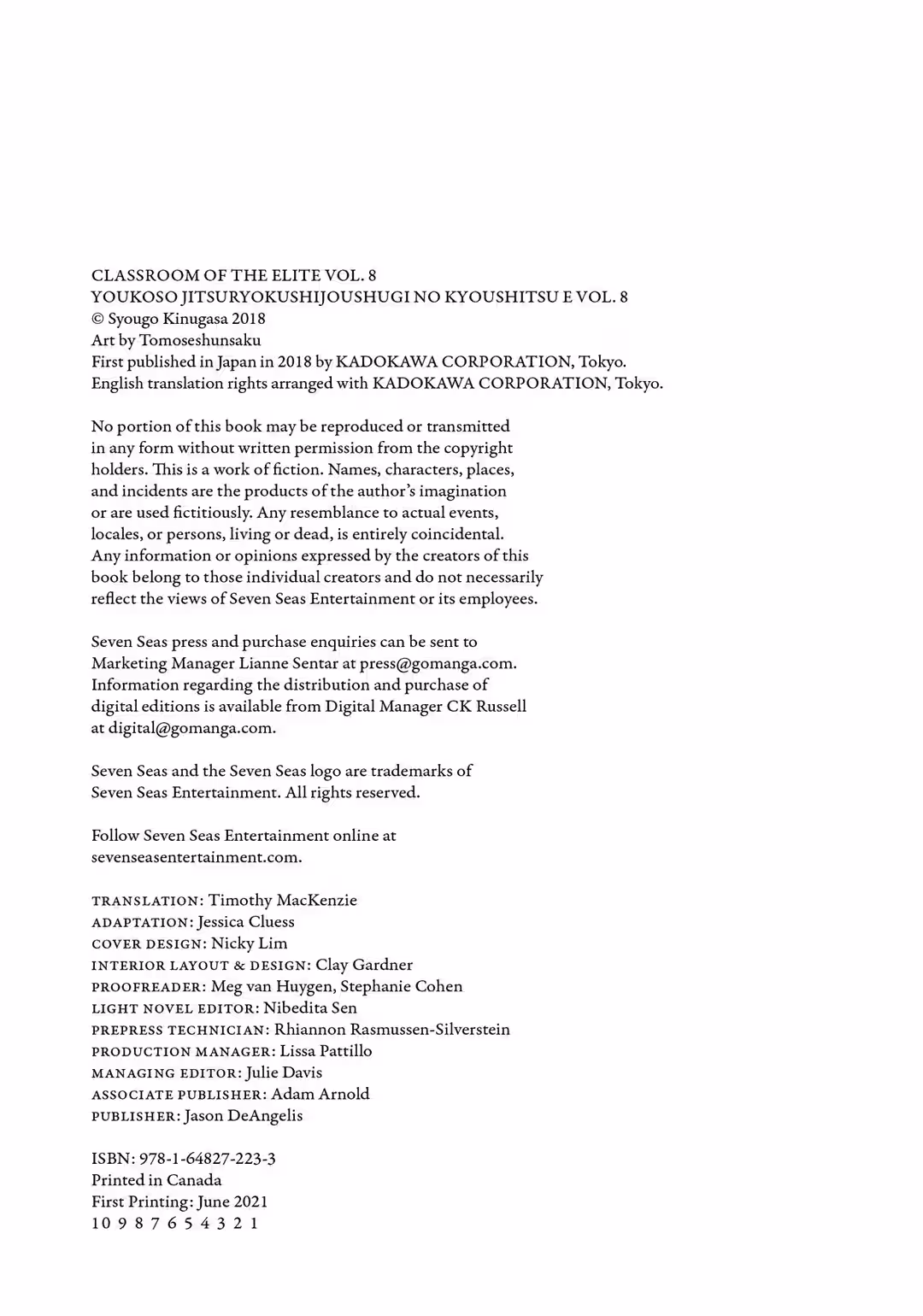 Anyhow, before I even noticed, it was already May. Time really does fly, doesn’t it? Time has passed in the blink of an eye, considering it’s been a full three years since I first released Classroom of the Elite. Back when I was working on volume 1, part of me didn’t believe I’d be able to go on selling my works and writing for this long. I’m extremely delighted. But I’ve also become keenly aware that it’s not just my fingers that are aching. My entire body is falling apart. I’m really going to take better care of myself.