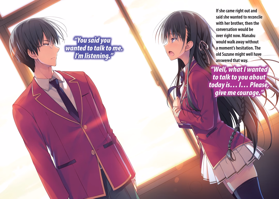 “Yes. The current staff were vehemently opposed, and it seems they were able to prevent that rule from being put in place. At any rate, cooperating with this individual to get you expelled that way would be the dullest possible thing. I decided to allocate every praise vote from Class A to you, in order to protect you no matter what. That way, even if someone was acting in secret to get you expelled, it wouldn’t work,” said Sakayanagi.