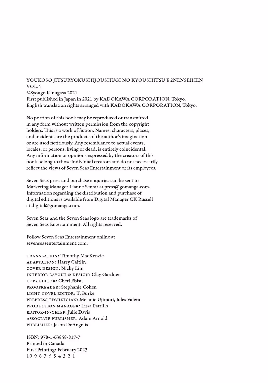 The next volume—which will be volume 4.5—will show what happens following the special exam as the students spend their summer vacation on a luxury cruise ship. I hope you’ll pay close attention to the details of the uninhabited island exam, as well as to episodes about characters that haven’t previously been mentioned. There may or may not be changes in the love lives of Ayanokouji and other characters. And even matters about the White Room, which I touched on earlier, might…