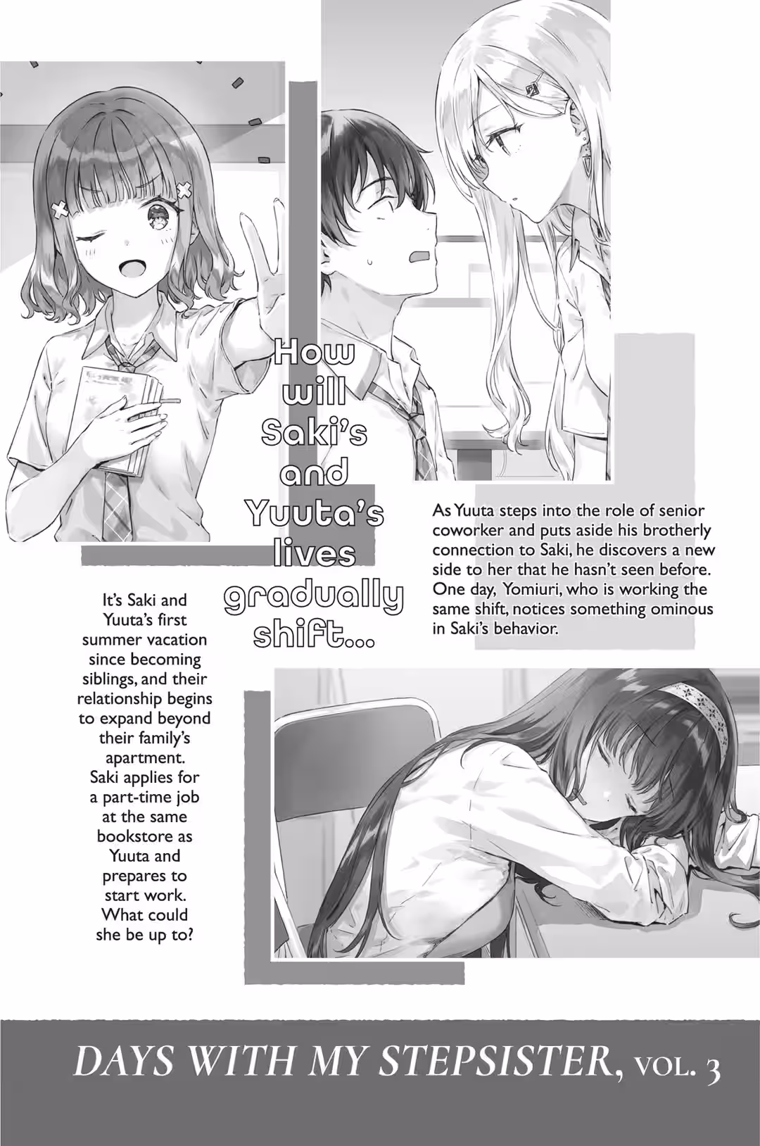 Thank you for picking up a copy of Days with My Stepsister, Volume 2. I’m Ghost Mikawa, author of the original YouTube and novel versions. This volume focuses on an unexpected weakness of Saki’s. She’s rational, calm, and collected, but she’s a little too serious. If you think about it, many of you might be able to relate.