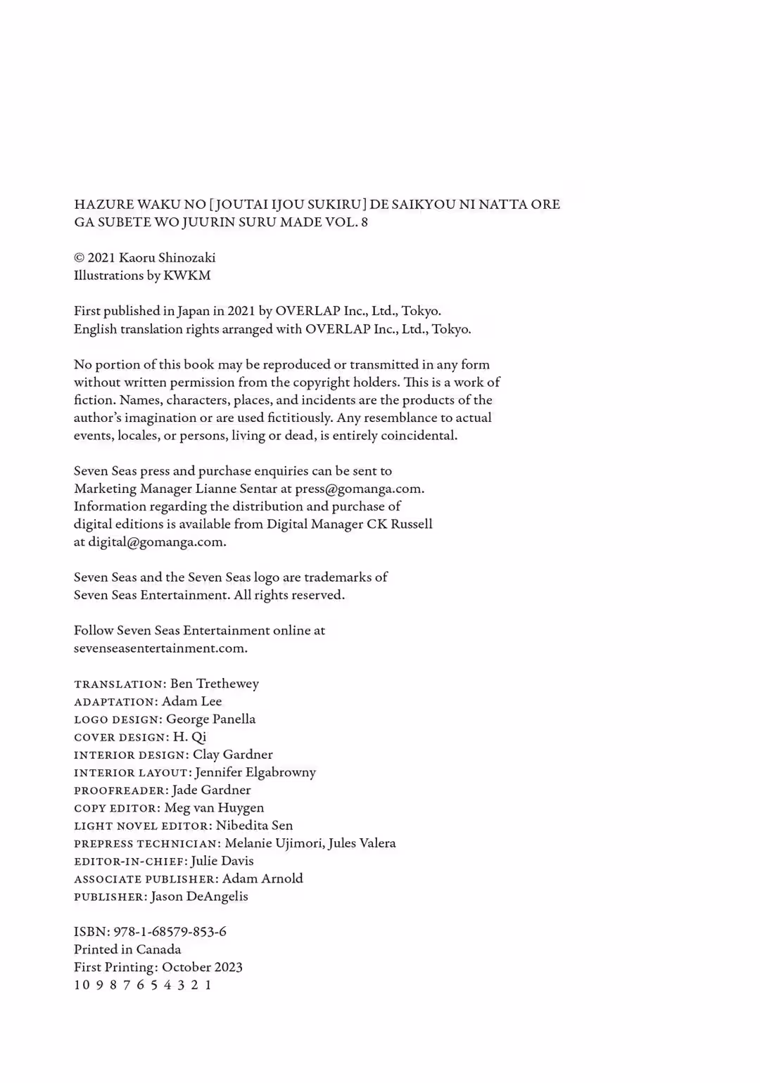 To Keyaki Uchiuchi-sama and Sho Uyoshi-sama, I always look forward to reading your drafts and new chapters of the manga version of this work (and I also enjoy them a lot). Thank you as well to everybody who helped bring this eighth volume to print.