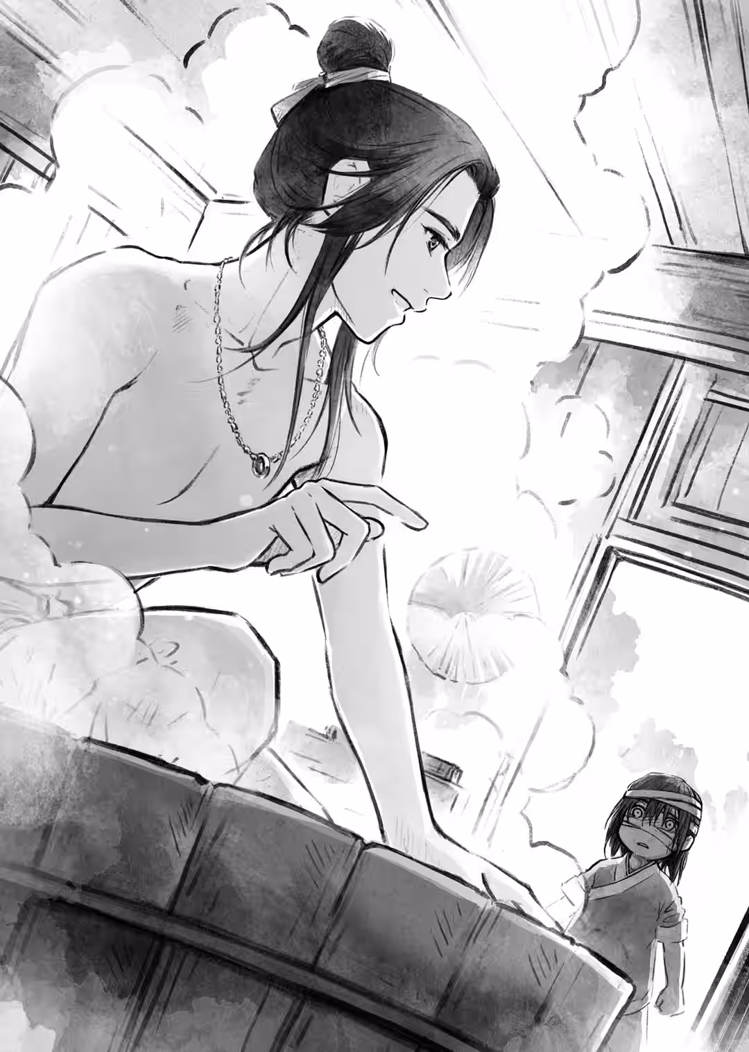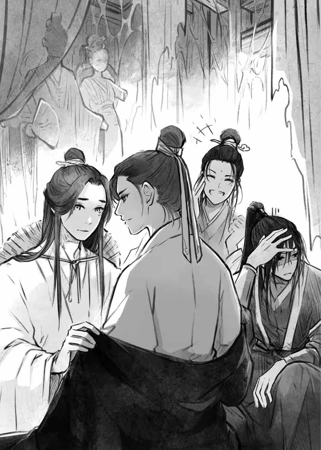 Xie Lian was already dressed quite plainly, so he didn’t need to change. However, the other three changed their looks thoroughly from head to toe. On one side of the alley, Shi Qingxuan voiced his critique of Ming Yi’s new getup. On the other side, Hua Cheng changed into a set of refreshing black robes. His long hair was tied up neatly and properly, which was a rare sight. Complemented by a white jade hair accessory, the new style changed his languid appearance into something more spirited. He looked like an extraordinarily handsome and intelligent young disciple of some renowned orthodox sect, as intensely eye-catching as always—an emperor simply couldn’t look like a beggar, even if you forced him to dress like one. As he gazed at him, Xie Lian couldn’t help but remember the saying: “For men to impress, in black they must dress.” He reflected on the profound truth of this statement.