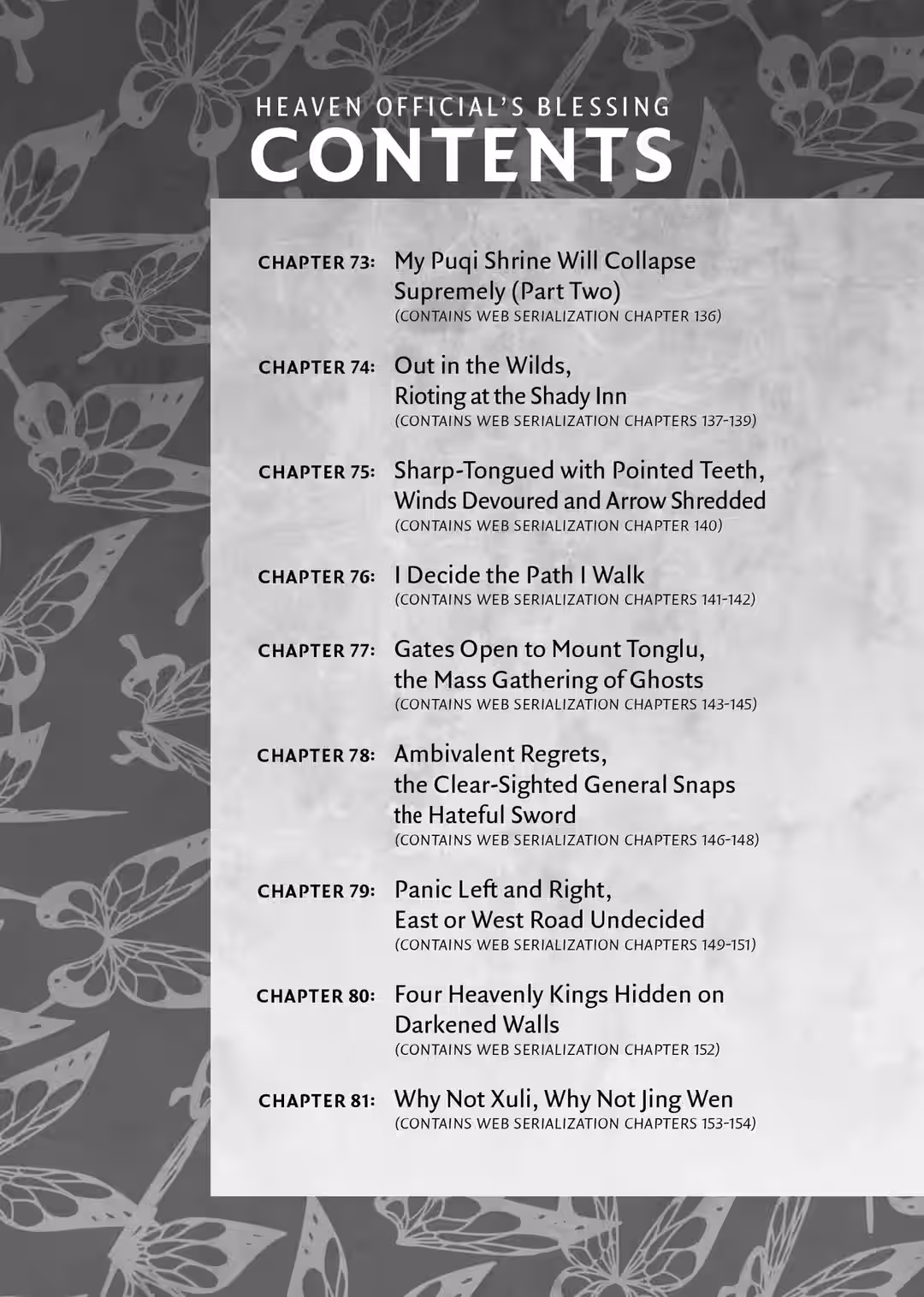 However, Xie Lian shook his head. “That was before. Now that Qi Ying is chasing Ling Wen, we’ve got more important matters on our hands. San Lang…” He stared at Hua Cheng in his arms, his gaze intent. “Your form…seems to have changed again.”