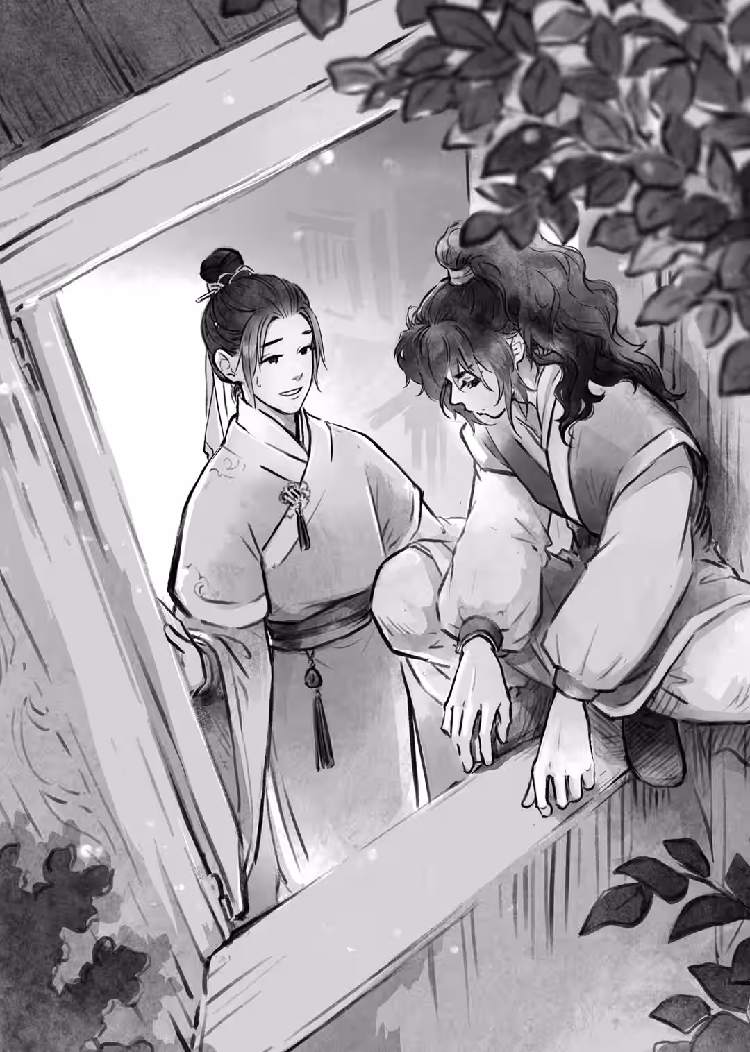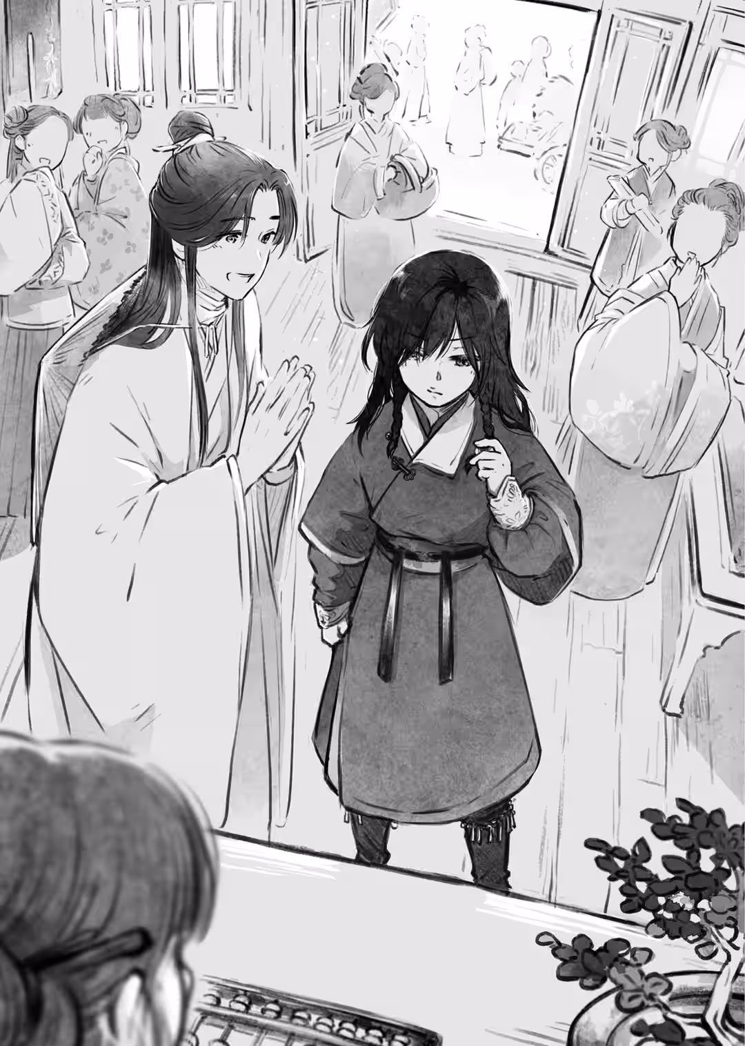 Lang Ying’s clothes were suited to a fifteen- or sixteen-year-old and no longer fit the current Hua Cheng, so Xie Lian picked out a new outfit especially for him. Xie Lian’s eyes lit up the moment he came into view.