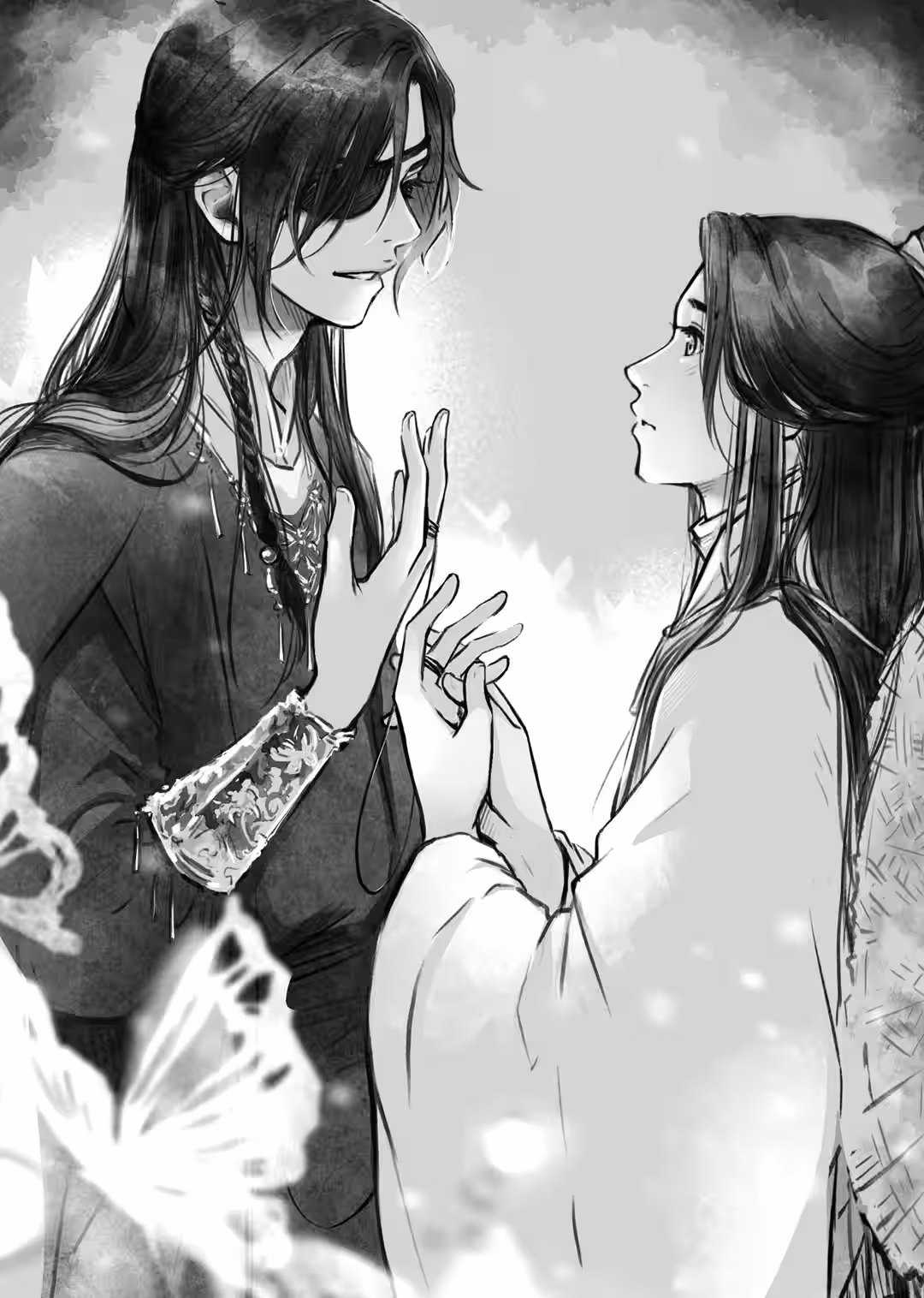 Xie Lian’s hands clenched, but he quickly loosened his grip when he remembered he was still holding hands with Hua Cheng.