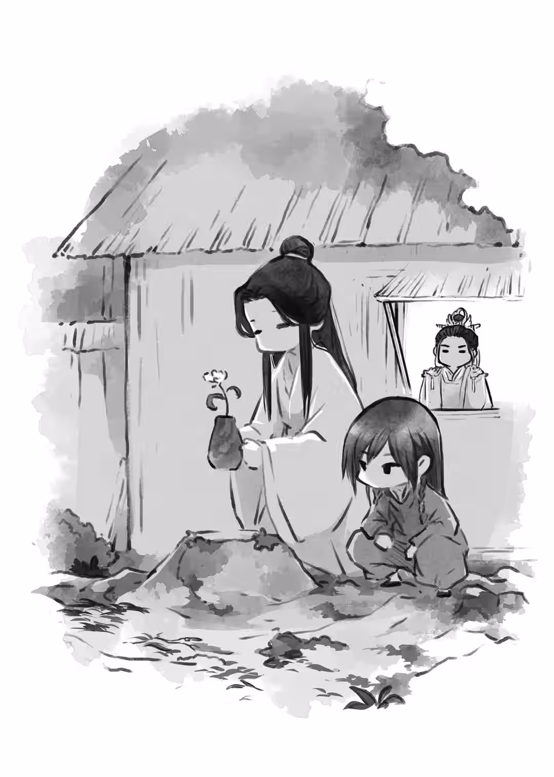When Hua Cheng was disguised as Lang Ying earlier, he had the appearance of a fifteen- or sixteen-year-old boy, and it wasn’t easy for Xie Lian to carry him—even if he could, it wouldn’t look good. But Hua Cheng seemed to have shrunk, and he now looked to be at most eleven or twelve. Xie Lian could carry him with one arm, or even have him perch on his shoulder. However, Hua Cheng’s air of composed ease had never wavered.