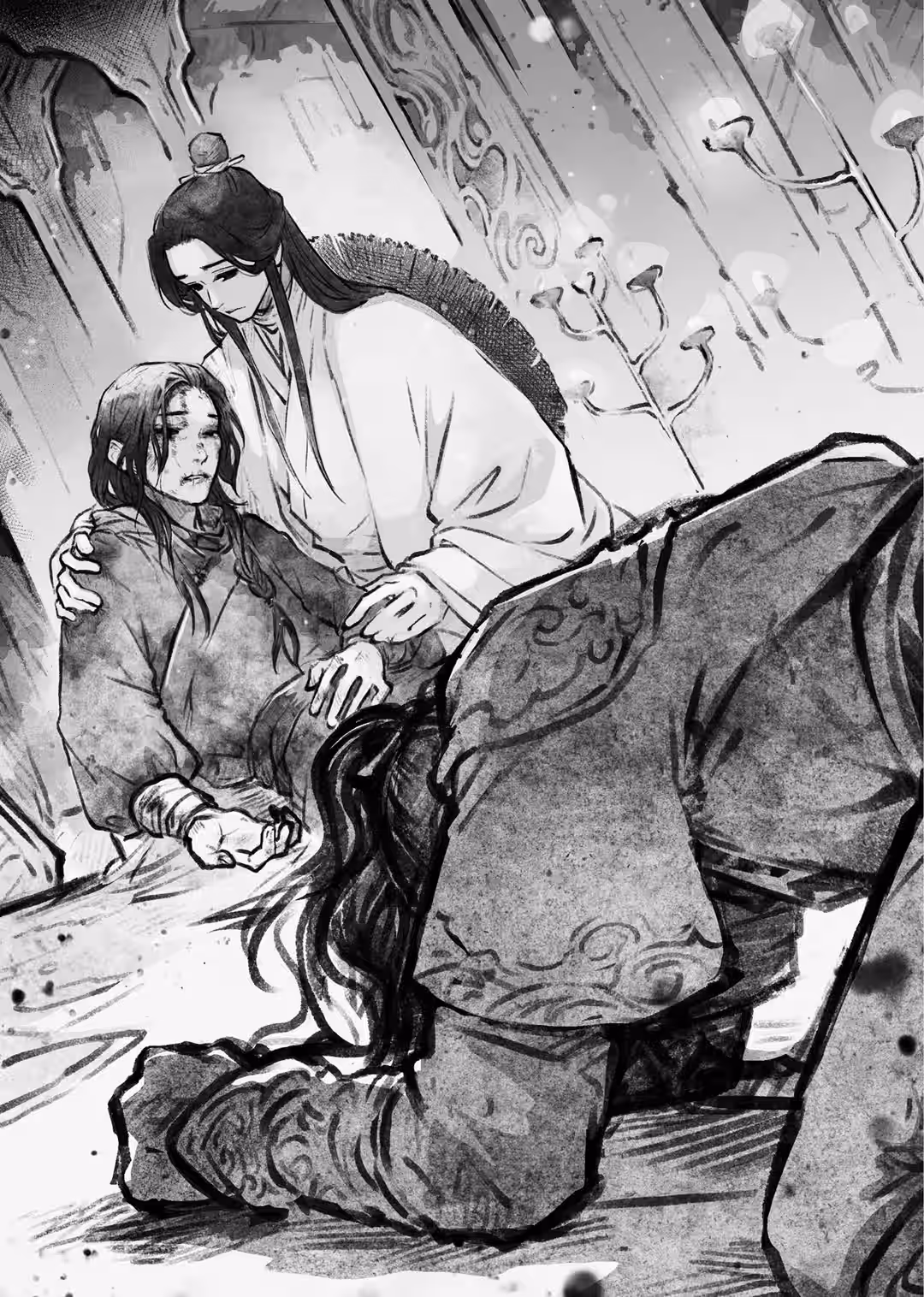XIE LIAN LAY on the hard, unforgiving ground with that half-crying, half-smiling mask stuck to his face. Next to him, White No-Face seemed to be admiring the sight of the appearance that was exactly like his own. The cry-smiling mask was secured to Xie Lian’s face with a peculiar force, and he couldn’t remove it no matter how he tried.