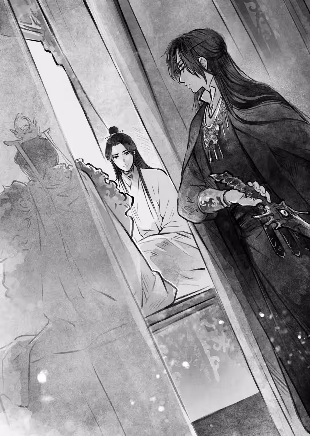 Xie Lian hung on to his consciousness through the pain. He seemed to have truly angered White No-Face; the creature’s tone was thick with frost as he picked up the black sword and slowly raised it to point threateningly at Xie Lian.