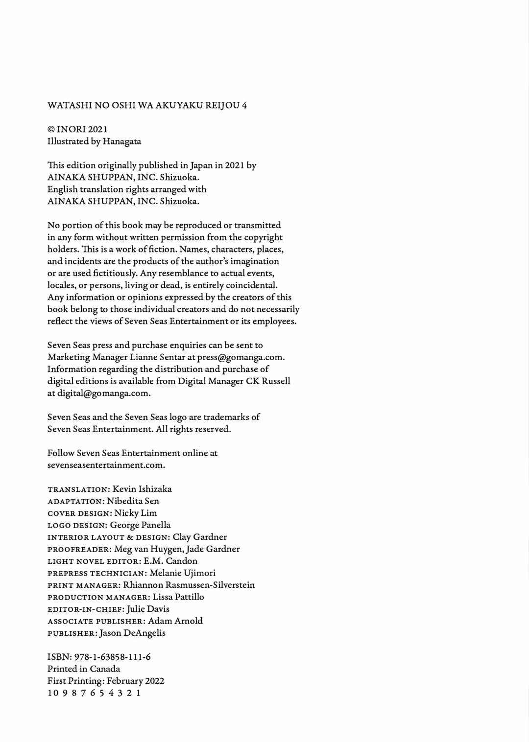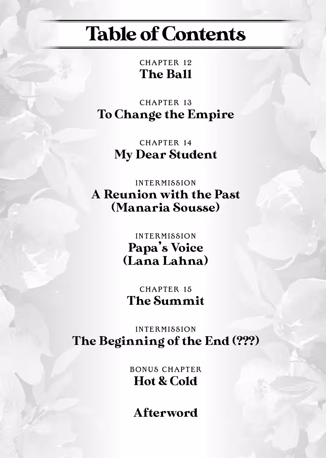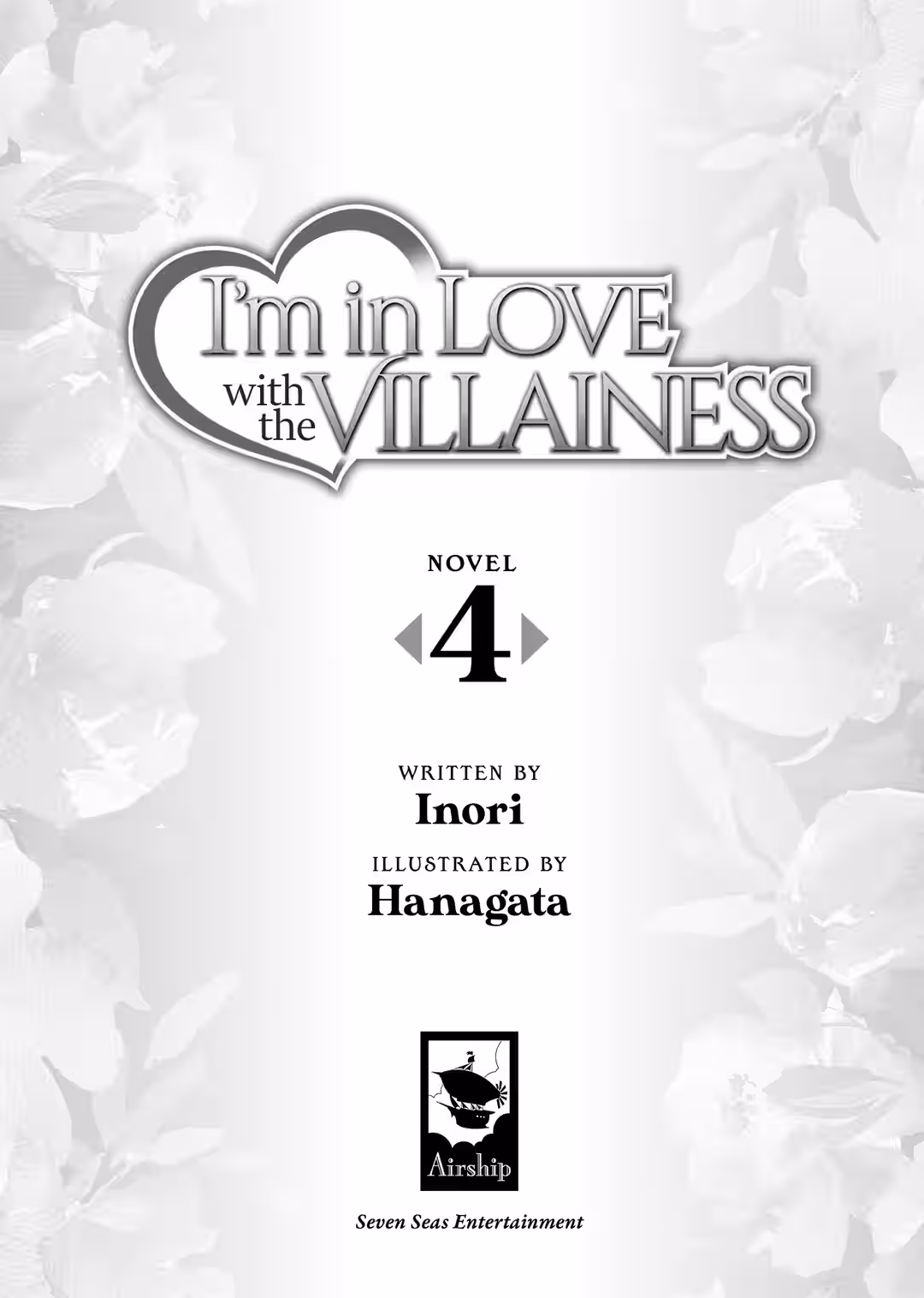 THANK YOU SO MUCH for purchasing Volume 4 of I’m in Love with the Villainess. I’m the author, Inori. This volume includes Chapters 12 through 15 of the web novel, as well as an end-of-volume special. I hope you enjoyed it.
