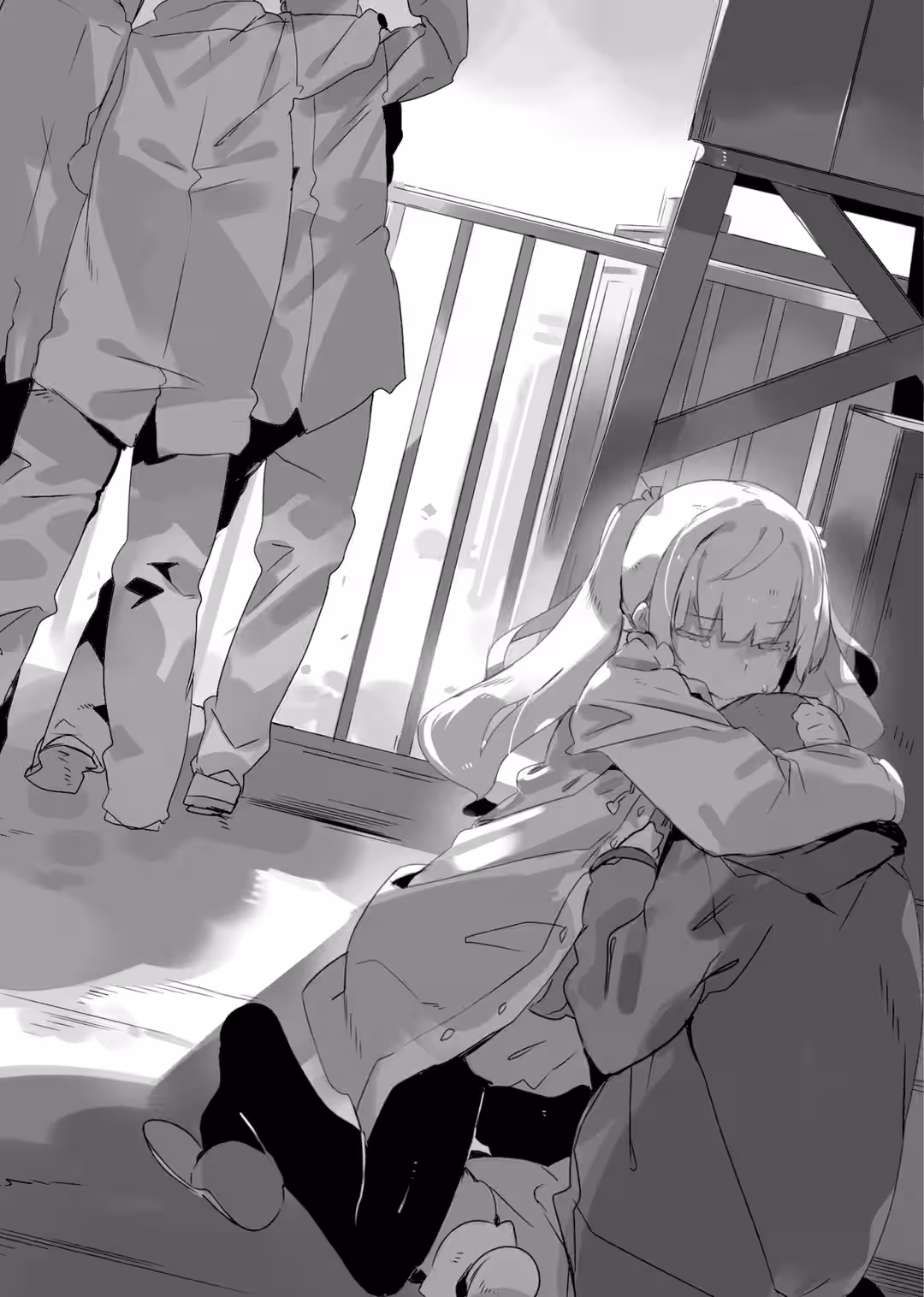 The girl kneeled next to him, looking at his dirty clothes regretfully. “I-I’ll cover the expense…”