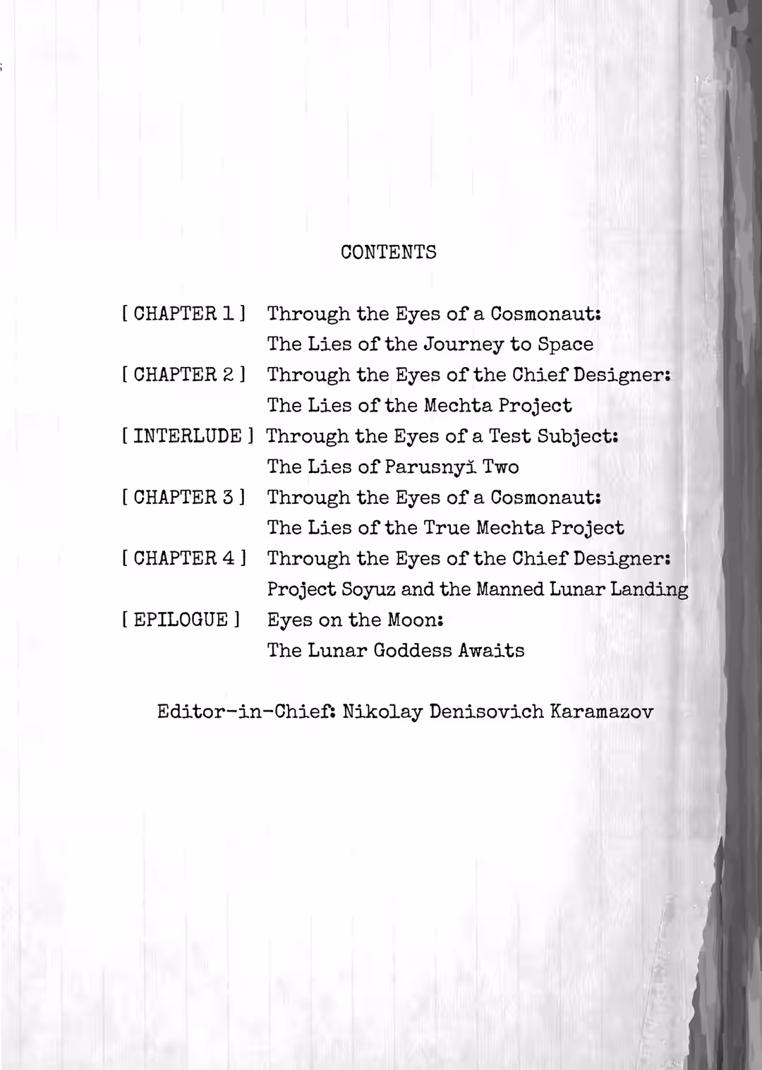 Despite what the True Mechta Project achieved in terms of PR, it didn’t bring the UZSR closer to the moon. Agate I’s spacewalk was no simple feat, but in practice, all the engineers really did was put a human in space. Even more pointless projects were already scheduled, however, including a twenty-day trip and a spacewalk without a lifeline. Those would certainly make headlines, but they would also waste the country’s limited time and budget. It might as well have been a circus after all.