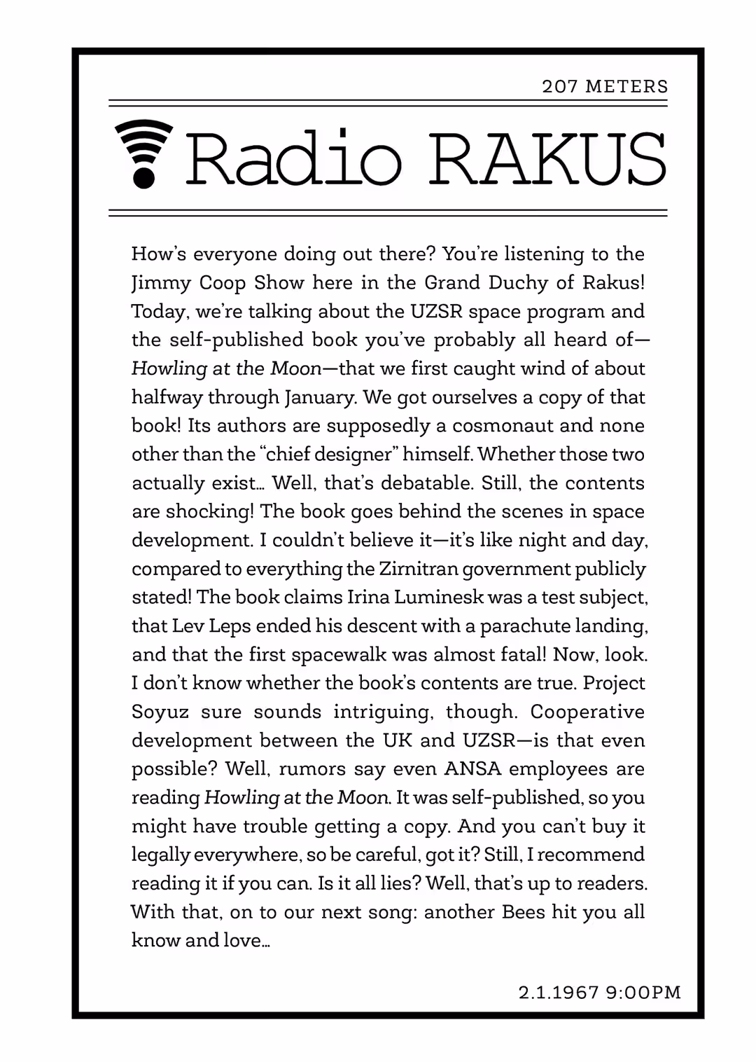 A wave of tension flooded the room. It wasn’t just staff in the blockhouse following Agate I’s spacewalk; television and radio stations were broadcasting the event live across the UZSR.