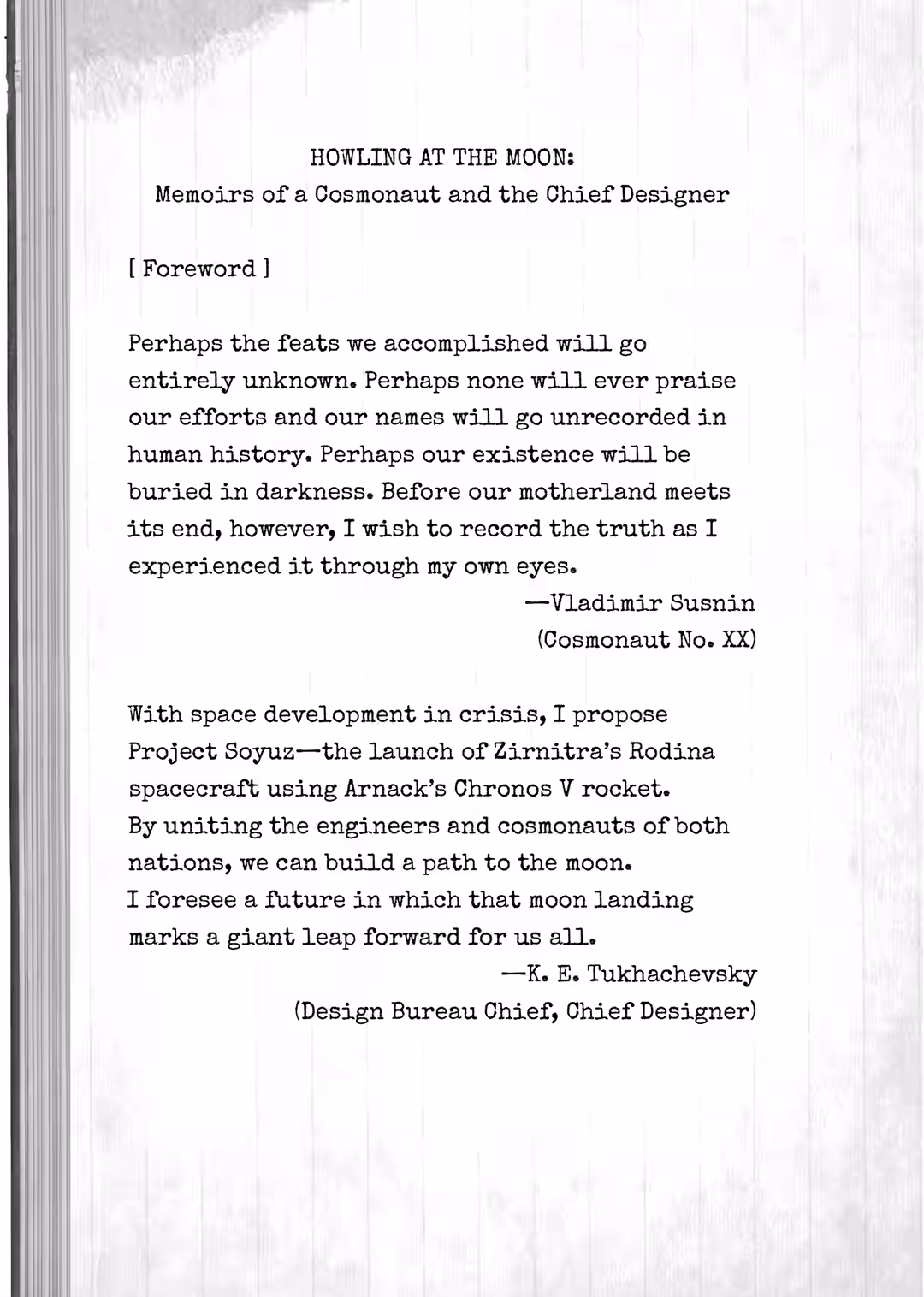 Suppressing his anger at the man who’d sent Mikhail to his death and offered no consolation, Lev responded, “Project Soyuz has a one hundred percent chance of success, and the design specs are accounted for.”