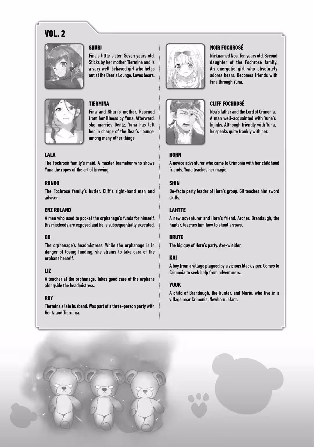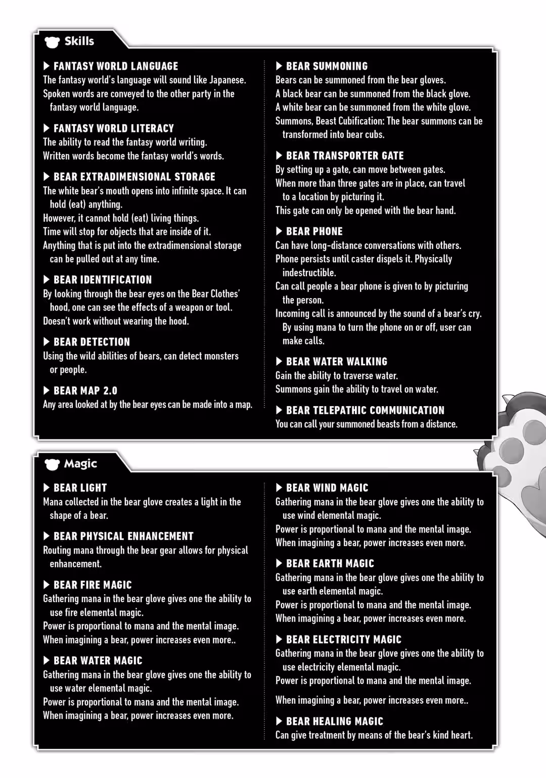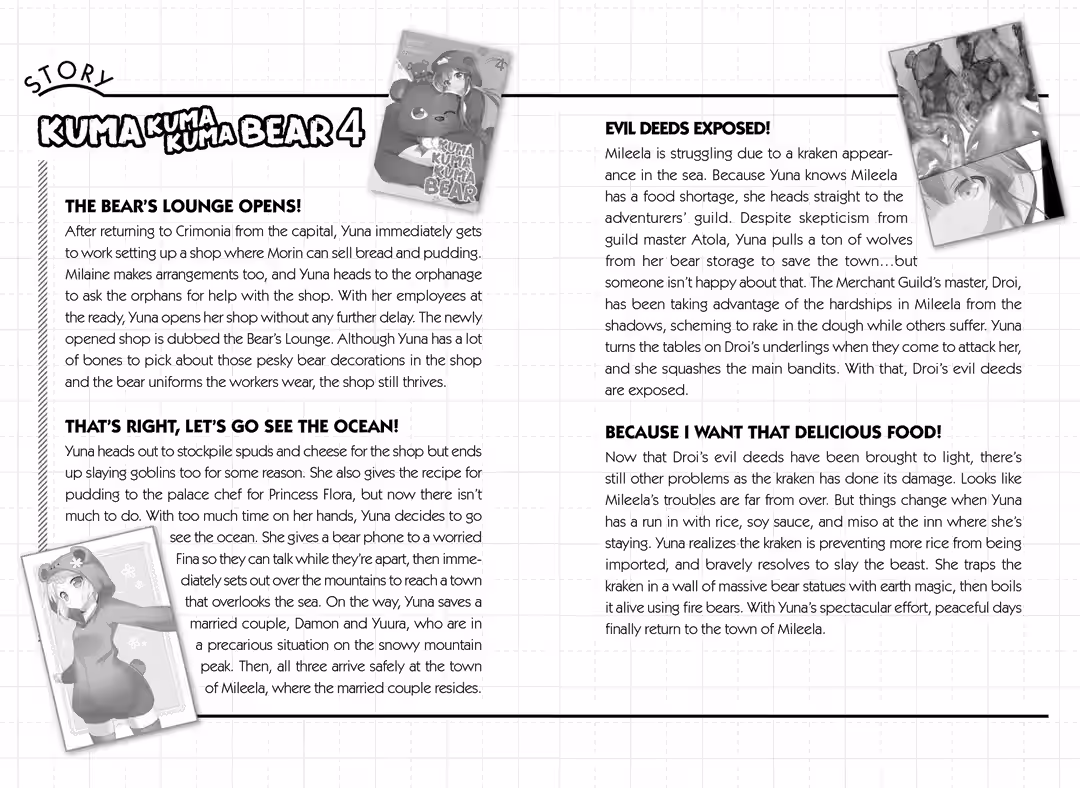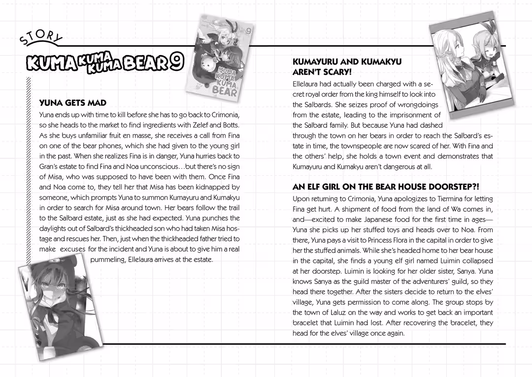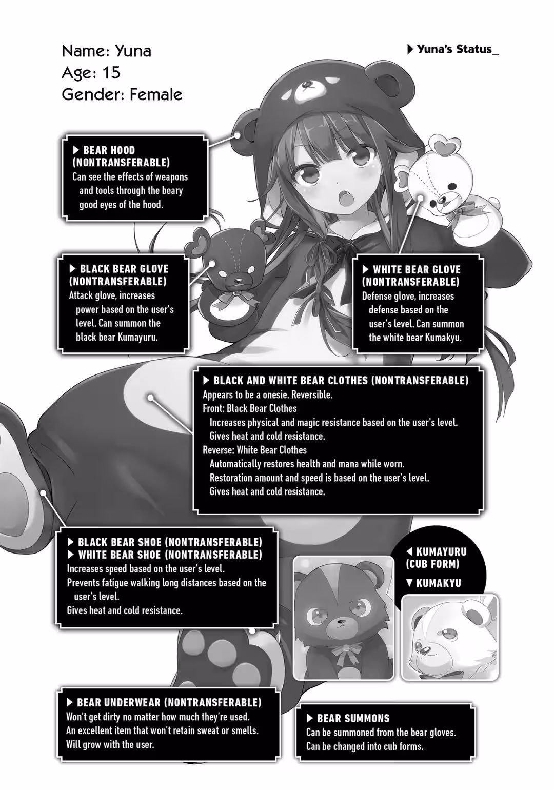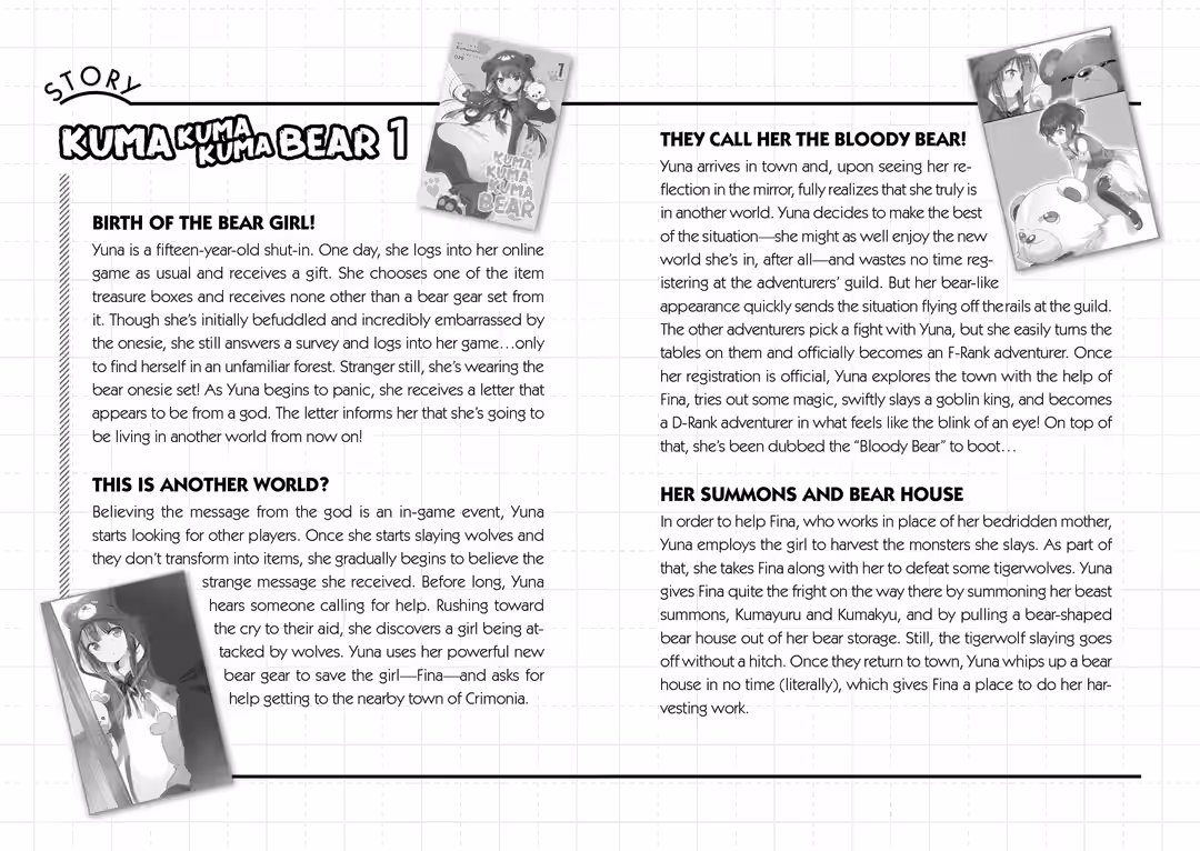 Yuna is a fifteen-year-old shut-in. One day, she logs into her online game as usual and receives a gift. She chooses one of the item treasure boxes and receives none other than a bear gear set from it. Though she’s initially befuddled and incredibly embarrassed by the onesie, she still answers a survey and logs into her game…only to find herself in an unfamiliar forest. Stranger still, she’s wearing the bear onesie set! As Yuna begins to panic, she receives a letter that appears to be from a god. The letter informs her that she’s going to be living in another world from now on!