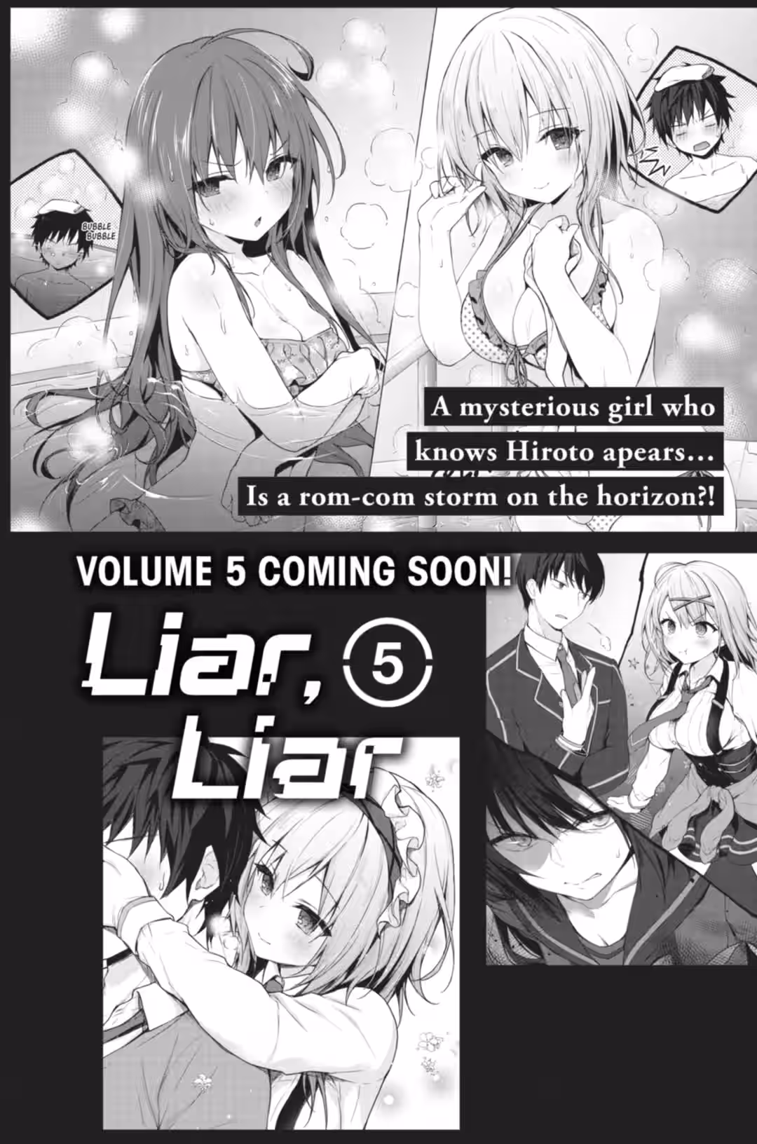 Hello, good afternoon, or good evening. This is Haruki Kuou. Thank you very much for picking up Liar, Liar, Vol. 4: The Lying Transfer Student Is Bossed Around By the Delusional Middle School Genius!