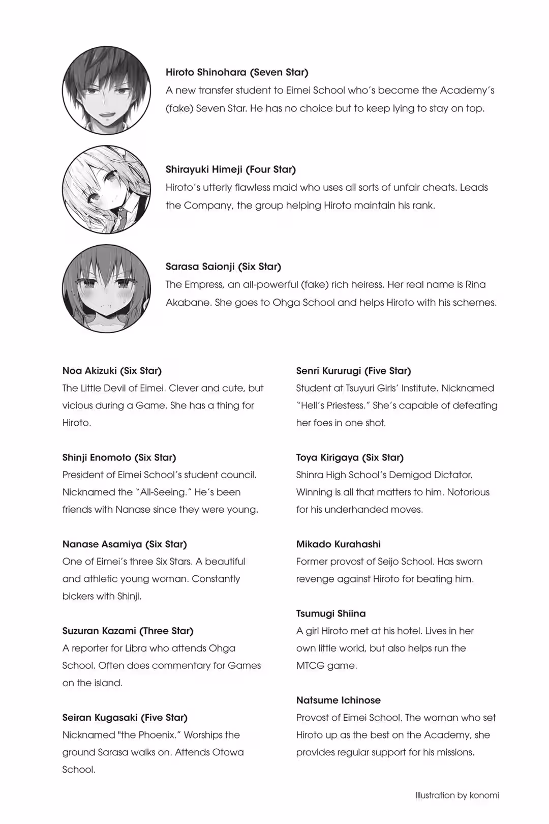 As Himeji spoke, she brought up a few more images showing the basic rules of ASTRAL, some promo videos, and so on. This was a huge event, something that only select students from each ward were allowed to join. It was a Game, too, so of course stars—the units in the absolute ranking system that decided a student’s class—would change hands. Basically, unless a team finished in the top five, each of its members would lose a star. Nobody in this Game could afford to lose.