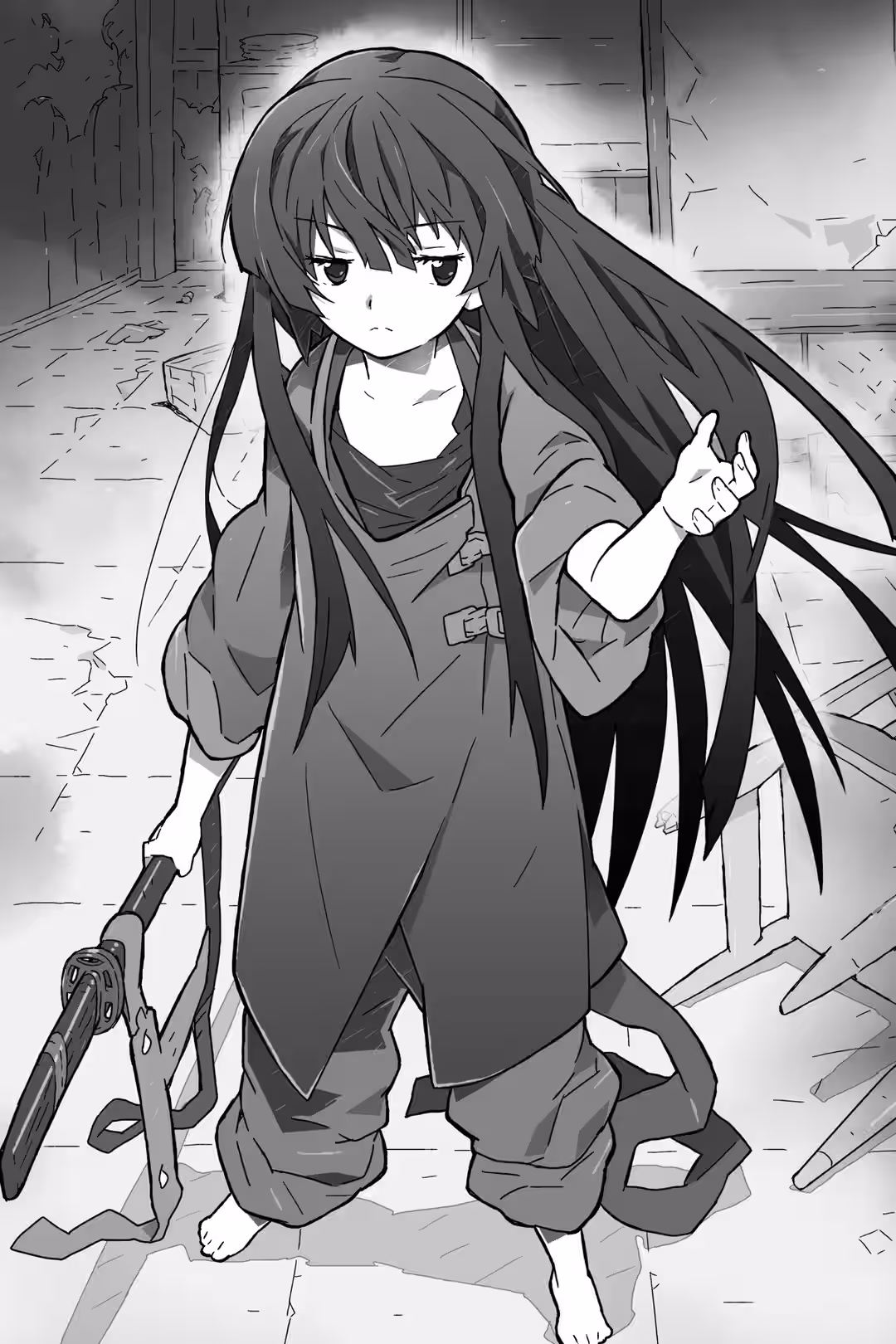 A girl who had the air of a swallow about her darted through the space Naotsugu’s advance had cleared. A grotesque creature like a split rugby ball with glass fangs sprang at her, but the girl cut it down with her short sword as she ran, not even pausing. This was Akatsuki: a slight girl whose black hair danced in the wind. Also Shiroe’s friend, she felt no qualms about calling him “my liege.” She was an Assassin, a type of master swordsman whose techniques included a one-strike kill and which boasted the greatest physical attack force of all twelve classes.