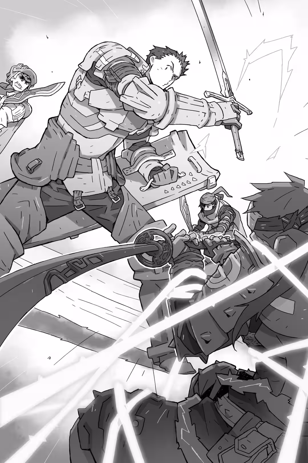 The silver-armored warrior charging down the moss-covered path, sweeping his shield from side to side, was Naotsugu. He was a tall guy with short hair and bright, lively eyes, and he and Shiroe had been friends for years. His class was Guardian. The three Warrior classes specialized in single-handedly fielding enemy attacks, and of the three, Guardians had the highest Defense. In Elder Tales, they boasted the nickname “The Unbreakable Shield.”