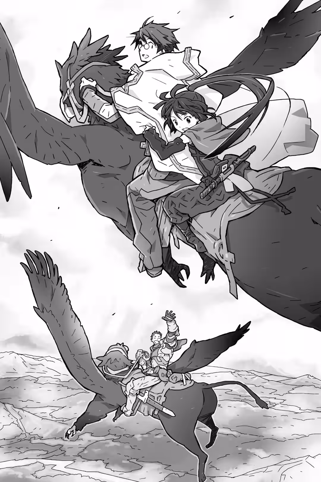 Akatsuki gave a small nod. At the pressure from Shiroe’s bootheels, the griffin soared up the slope of the wind, over the dazed, upturned faces of the Briganteers and the heads of the Adventurers who’d come out from Susukino. The three enormous creatures flew away, leaving the echoes of savage, magnificent wingbeats behind them.