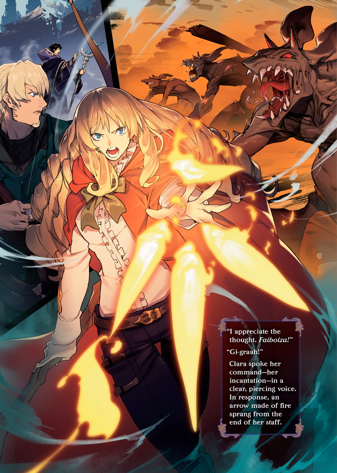 “There isn’t enough time for that!” As I began my spell, Clara dug her heels in next to me and thrust her staff into the air. “I’ll handle this!” Another beautiful incantation sprang from her ruby lips: “Falga Lans!”