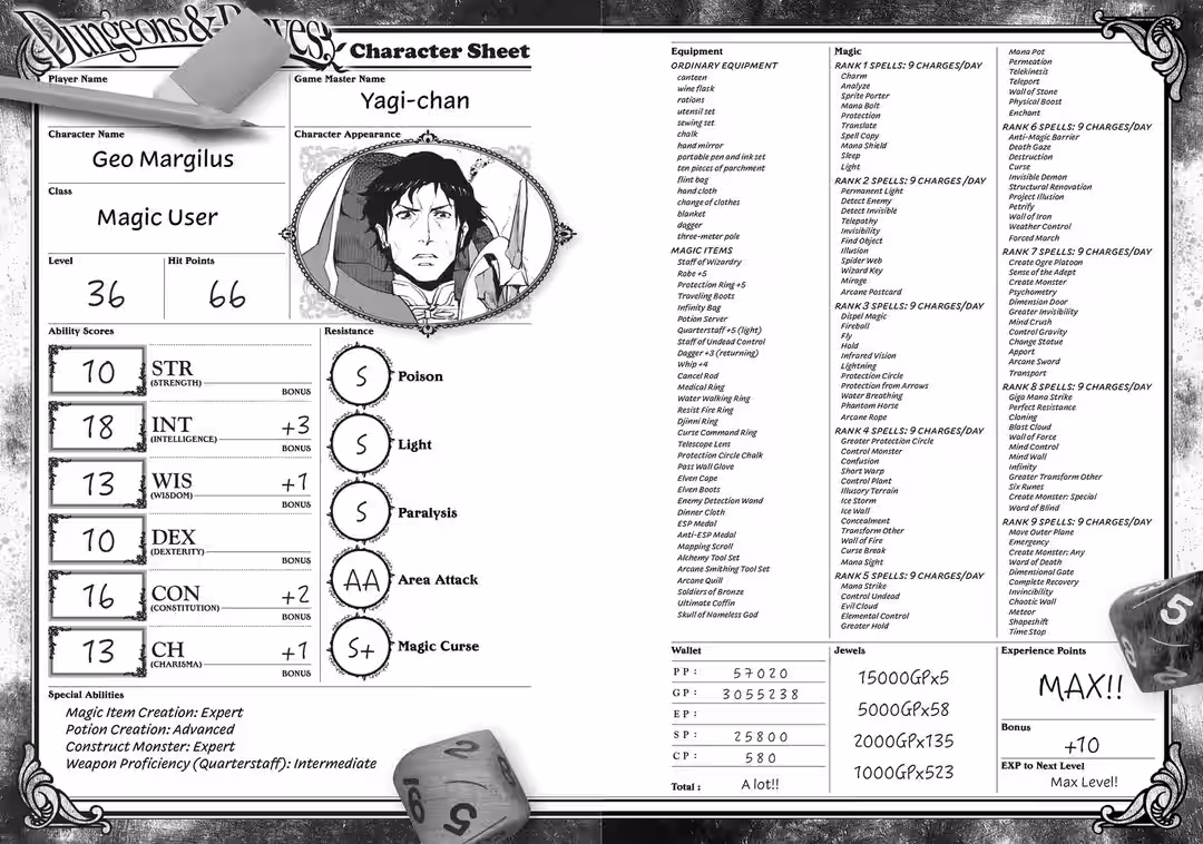 A STRANGE ENTITY that called itself the “Watcher” transported me, a humble businessman (Age: 42, Marital Status: Single), to the continent of Sedia in another world. To sweeten the deal, he gave me the ability scores of my character Geo Margilus, the magic user I painstakingly raised to maximum level in the obsession of my youth, the tabletop role-playing game Dungeons & Braves.