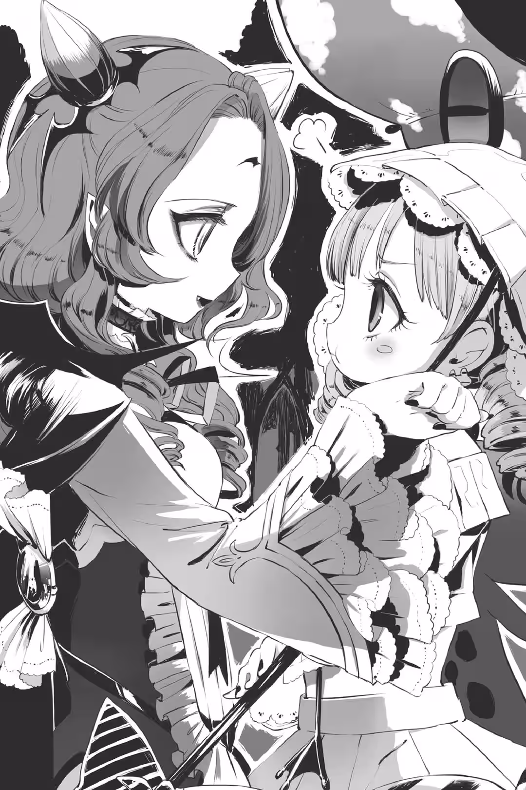 It would be better to go with something less anxiety-inducing, less dangerous, and more reliable—a plan that would avoid needless harm to her friends, one with which they could safely subdue the intruders. Imagining something like a riot police suppressing a mob, Shadow Gale said to Pfle, “Miss, weren’t you just bragging that you’ve become a pretty important person in the Magical Kingdom?”