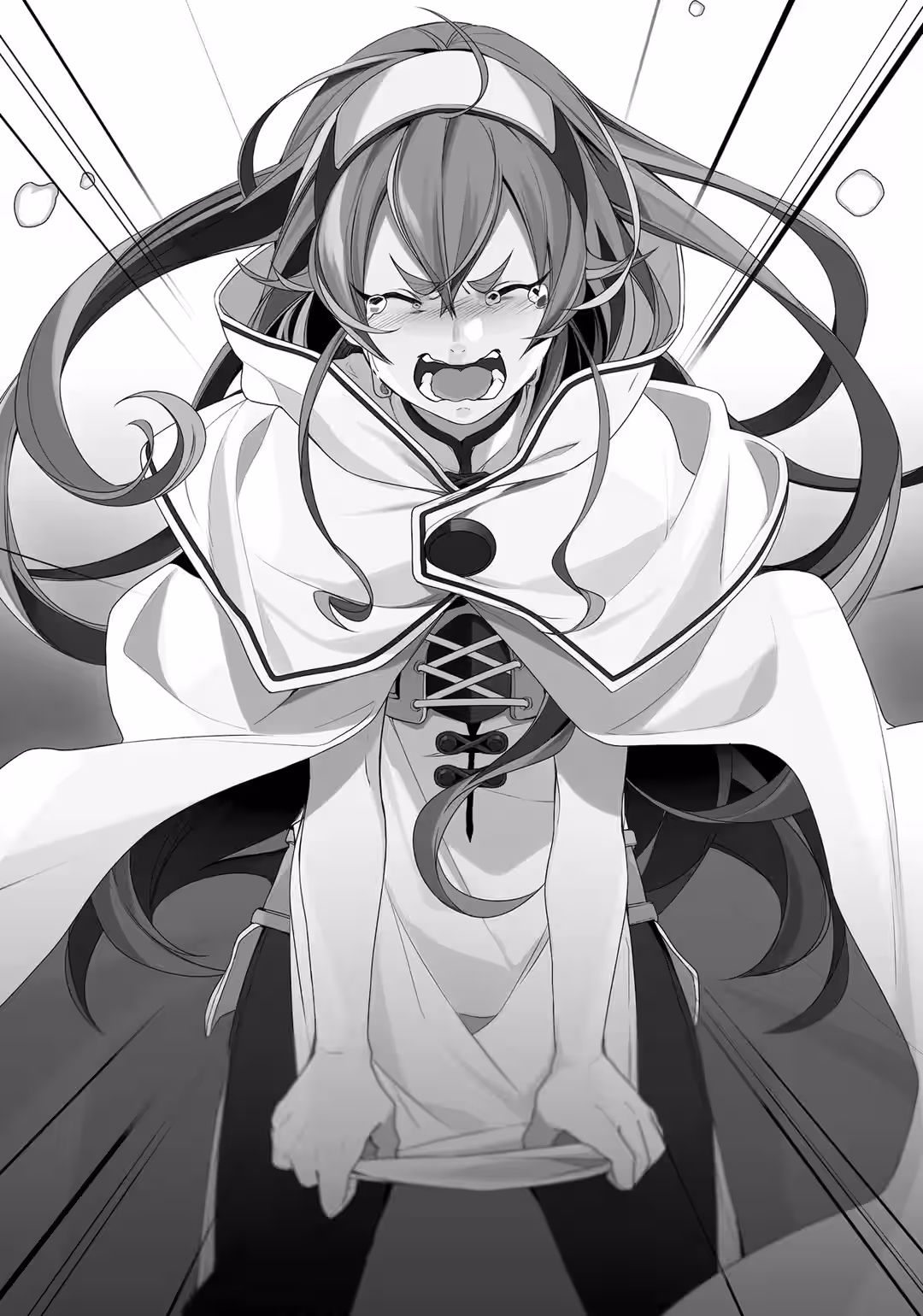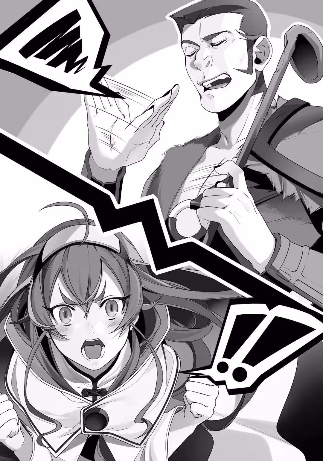 The moment we arrived in the city, the red-haired girl riding the lizard with me suddenly leaped up. Her name was Eris Boreas Greyrat. She was the granddaughter of Sauros, the Liege Lord of Asura Kingdom’s Fittoa Region, and also my pupil back when I worked as a tutor for their house. She was ferocious and spoiled rotten when we first met, but she’d become more flexible recently—enough to listen to what people had to say. She had been teleported together with me, and I had to see her safely back home.