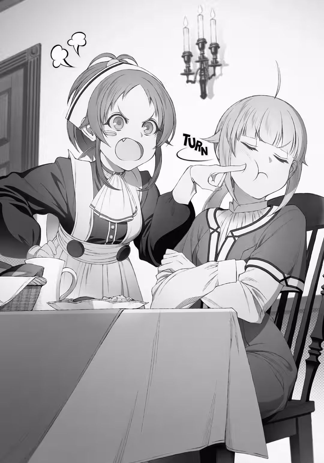 She hopped down from her perch and headed around the house, where she spotted Rudeus’ sister Norn with a boy about her age.