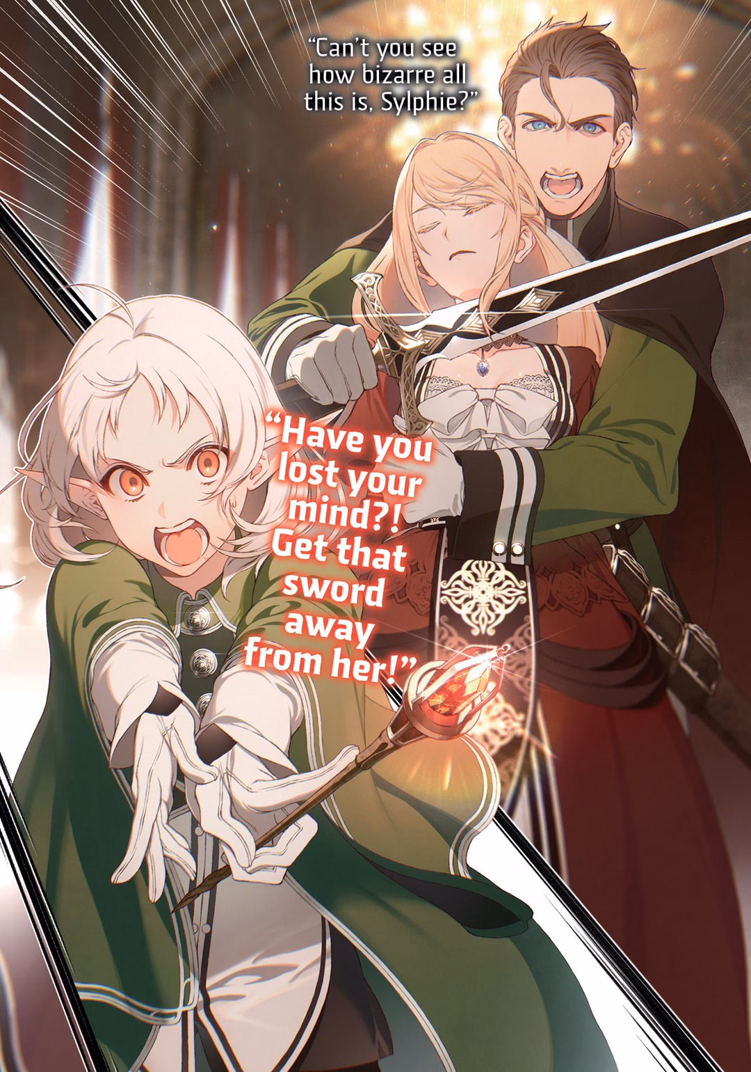 As I stepped forward to intervene, however, Eris abruptly dropped to one knee. “It’s an honor to meet you, sir. I’m Eris Greyrat, who recently became Rudeus’ wife. Thank you for your hospitality.”