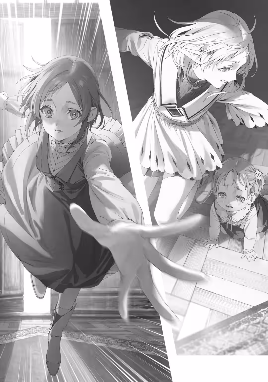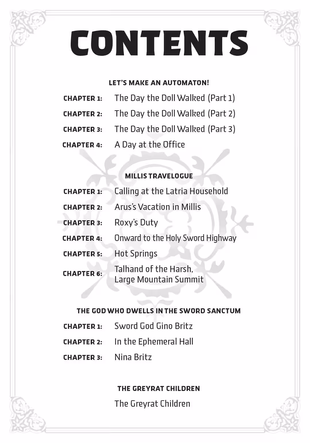 This girl was the culmination of the skills Zanoba and Rudeus had cultivated over long years of figurine making. Her body was constructed from artificial flesh and a skeleton of the same material as the magic armor. The base for the artificial flesh was clay Rudeus made using earth magic, to which they then added mana-rich scales from red dragons and illusion butterfly wings. To round it out, they mixed in the sap of an elder treant and the blood of an immortal demon. The finished flesh was the product of experimentation and the finest materials. It was durable enough to last almost indefinitely while feeling indistinguishable from a normal person’s skin. To make it move, it was mounted on a magic circle-engraved ­skeleton. The magic circles functioned like muscles to move the surrounding tissue. The principle was more or less the same as the magic armor, but the doll’s joints additionally incorporated parts made from the bone dust of a deathbreaker skeleton, utilizing the material’s particularly high mana conductivity to make the doll’s movements even more lifelike.